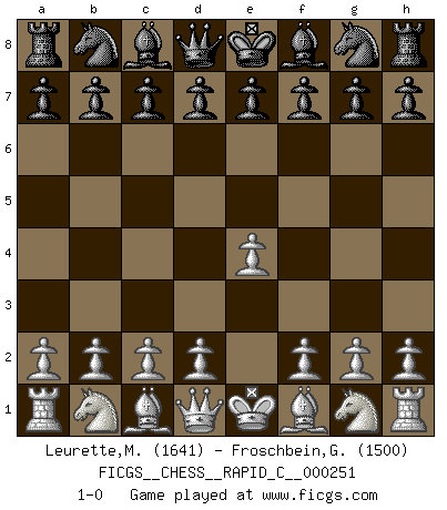 Last move : 1-0 2021 January 22 21:16:39 [Event "FICGS__CHESS__RAPID_C__000251"] [Site "FICGS"] [Date "2020.12.23"] [Round "1"] [White "Leurette,Marc-Antoine"] [Black "Froschbein,Gundel"] [Result "1-0"] [WhiteElo "1641"] [BlackElo "1500"] 1.e4 1-0 This chess game has been lost on time (started : 2020.12.23 0:5:23) King's pawn Opening Player White won this chess game. Follow this game move after move (download)The tactician must know what to do whenever something needs doing; the strategist must know what to do when nothing needs doing. (Savielly Tartakover) Du musst nicht gut spielen, es reicht, wenn du besser spielst als dein Gegner. (Anonymous) El poder defensivo de una pieza clavada, solamente es imaginario. (Aaron Nimzovich) Les Echecs ne sont pas pour les âmes timides. Ils requièrent un homme entier, qui ne s'arrête pas aveuglément à ce qui a été déjà établi, mais qui tente individuellement de sonder les profondeurs du jeu. (W. Steinitz) There's no money in correspondence chess. (John Knudsen)