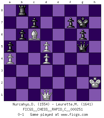 Last move : 0-1 2021 January 26 14:20:44 [Event "FICGS__CHESS__RAPID_C__000251"] [Site "FICGS"] [Date "2020.12.23"] [Round "1"] [White "Nurcahyo,Dery"] [Black "Leurette,Marc-Antoine"] [Result "0-1"] [WhiteElo "1554"] [BlackElo "1641"] 1.c4 e5 2.Nc3 Nf6 3.d3 Bb4 4.Nf3 Bxc3+ 5.bxc3 Nc6 6.h3 e4 7.Nd4 exd3 8.exd3 O-O 9.Ba3 Re8+ 10.Be2 b6 11.O-O Nxd4 12.cxd4 d6 13.Bf3 Rb8 14.Qa4 a5 15.Rfe1 Bf5 16.Rxe8+ Nxe8 17.Bc6 Bxd3 18.Re1 Nf6 19.g4 h6 20.h4 d5 21.g5 hxg5 22.cxd5 Qc8 23.Re3 Qg4+ 24.Rg3 Qe2 25.Rxd3 Qxd3 26.hxg5 Ng4 27.Bc1 Qe2 28.Be3 Nxe3 29.fxe3 Qxe3+ 30.Kh2 Qxg5 31.Qd1 g6 32.a4 Kg7 0-1 English Opening Kingside Castling by player Black (move 8) Kingside Castling by player White (move 11) Player Black won this chess game. Follow this game move after move (download)Fischer was a master of clarity and a king of artful positioning. His opponents would see where he was going but were powerless to stop him. (Bruce Pandolfini) Wir irren allesamt, nur jeder irrt anders. (Georg Christoph Lichtenberg) El Ajedrez es el arte del análisis. (Mikhail Botvinnik) Votre prénom est 'Tactique', votre deuxième prénom est 'Tactique' et votre nom est 'Tactique'. (Ken Smith) Internet: Absolute communication, absolute isolation. (Paul Carvel)