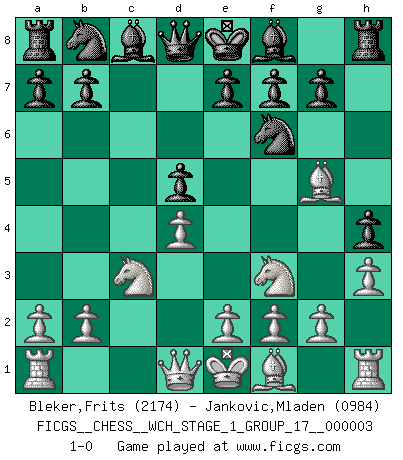 Last move : 1-0 2007 August 24 11:22:4 [Event "FICGS__CHESS__WCH_STAGE_1_GROUP_17__000003"] [Site "FICGS"] [Date "2007.07.11"] [Round "1"] [White "Bleker,Frits"] [Black "Jankovic,Mladen"] [Result "1-0"] [WhiteElo "2174"] [BlackElo "0984"] 1.d4 d5 2.Nf3 Nf6 3.c4 h5 4.Nc3 h4 5.h3 c6 6.cxd5 cxd5 7.Bg5 1-0 This chess game has been lost on time (started : 2007.07.11 17:23:48) Queen's pawn game Player White won this chess game. Follow this game move after move (download)White lost because he failed to remember the right continuation and had to think up the moves himself. (Siegbert Tarrasch) Wenn du nicht weißt was du tun sollst, warte bis dein Gegner eine Idee hat. Sie wird sicher schlecht sein. (Siegbert Tarrasch) El Ajedrez es un invernadero donde los frutos del carácter pueden madurar mas completamente que en la vida. (Edward Morgan Foster) Echiquier : carré parfait, comme la Jérusalem nouvelle décrite par l'auteur de l'Apocalypse, huit cases sur huit, exaltation du chiffre 4, symbole du cosmos aux quatre horizons... où le noir et le blanc, l'ombre et la lumière, le mal et le bien s'entremêlent et se conjuguent. (Robert Couffignal, Le Gambit du poète) Warrior pose battles inner weakness and wins focus. You see that there is no war within you. You're on your own side, and you are your own strength. (Terri Guillemets)