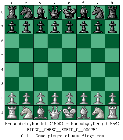 Last move : 0-1 2021 January 22 7:13:9 [Event "FICGS__CHESS__RAPID_C__000251"] [Site "FICGS"] [Date "2020.12.23"] [Round "1"] [White "Froschbein,Gundel"] [Black "Nurcahyo,Dery"] [Result "0-1"] [WhiteElo "1500"] [BlackElo "1554"] 0-1 This chess game has been lost on time (started : 2020.12.23 0:5:23) Player Black won this chess game. Follow this game move after move (download)Chess is 99 percent tactics. (Teichmann) Ich verlor meine Bürgerrechte, mein Gehalt wurde mir nicht mehr bezahlt und ich wurde zensiert und durfte nicht mehr ins Ausland reisen. [nach dem Match Fischer-Taimanov 6:0] (Mark Taimanov) El jugador blanco perdió porque fallo en recordar la coreccta continuación y tuvo que pensar por sí mismo las movidas. (Siegbert Tarrasch) Le jeu d'échecs fait naître et fortifie en nous plusieurs qualités précieuses dans le cours de l'existence, telles que la prévoyance, la circonspection, la prudence, et la persévérance. (Benjamin Franklin - 1783, la morale des échecs) I can't decide which is riskier; taking crazy risks, or taking advice on crazy risks from a crazy risk taker. (Gregory House in House M.D.)