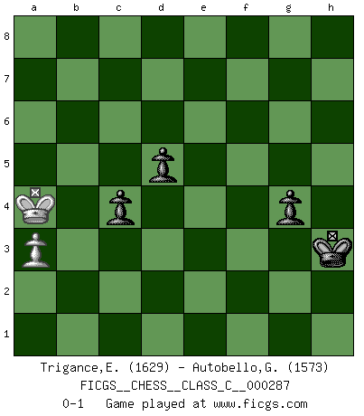 Last move : 0-1 2021 September 25 17:56:52 [Event "FICGS__CHESS__CLASS_C__000287"] [Site "FICGS"] [Date "2020.12.23"] [Round "1"] [White "Trigance,Emile"] [Black "Autobello,Giovanni"] [Result "0-1"] [WhiteElo "1629"] [BlackElo "1573"] 1.c4 Nf6 2.Nc3 b6 3.e4 Bb7 4.e5 Ne4 5.Qf3 Nc5 6.Qg3 Nc6 7.Nge2 d6 8.d4 Nd7 9.e6 fxe6 10.Be3 Nf6 11.Nf4 Qd7 12.Be2 e5 13.dxe5 Nxe5 14.Nfd5 Nxd5 15.cxd5 g6 16.f4 Nf7 17.Bg4 Qd8 18.Rd1 Bg7 19.Bd4 Bxd4 20.Rxd4 c6 21.Qe3 Qc7 22.dxc6 Bxc6 23.Nd5 Bxd5 24.Rxd5 Qc4 25.Be6 Qb4+ 26.Rd2 O-O 27.O-O Qc5 28.Qxc5 bxc5 29.f5 Kg7 30.Rdf2 Ne5 31.g4 Nxg4 32.Rf3 Ne5 33.Rb3 Rab8 34.Rxb8 Rxb8 35.b3 Rb4 36.fxg6 hxg6 37.Kg2 Rd4 38.Kg1 a5 39.h3 Rd3 40.Kg2 Rd2+ 41.Rf2 Rxf2+ 42.Kxf2 Kf6 43.Bd5 e6 44.Bc4 Nxc4 45.bxc4 d5 46.cxd5 exd5 47.Ke3 a4 48.a3 Kf5 49.Kd3 g5 50.Ke3 c4 51.Kd4 Kf4 52.Kc3 Kg3 53.Kb4 Kxh3 54.Kxa4 g4 0-1 English Opening Kingside Castling by player Black (move 26) Kingside Castling by player White (move 27) 10 pieces endgame at move 45 : White KPPP , Black KPPPPP WHITE : King + 3 Pawns BLACK : King + 5 Pawns 9 pieces endgame at move 46 : White KPPP , Black KPPPP WHITE : King + 3 Pawns BLACK : King + 4 Pawns 8 pieces endgame at move 46 : White KPP , Black KPPPP WHITE : King + 2 Pawns BLACK : King + 4 Pawns 7 pieces endgame at move 53 : White KP , Black KPPPP WHITE : King + 1 Pawn BLACK : King + 4 Pawns 6 pieces endgame at move 54 : White KP , Black KPPP WHITE : King + 1 Pawn BLACK : King + 3 Pawns Player Black won this chess game. Follow this game move after move (download)If your opponent cannot do anything active, then don't rush the position; instead you should let him sit there, suffer, and beg you for a draw. (Jeremy Silman) Meine Liebe ist Schach, Schach, Schach. Ich muss jeden Tag Schach spielen, deshalb fühle ich mich so stark. (Miguel Najdorf) El Ajedrez es el juego mas altamente simbólico, pero las agresiones estan por lo tanto aún mas francamente representadas en la partida. Tal vez comenzo como un juego de guerra; Algo como la representación de una batalla en miniatura entre las fuerzas de dos reinos. (Karl Meninger) La guerre est enfant de la passion, la passion est enfant du narcissisme et le narcissisme est l'enfant. (...) Une autre partie ? (Thibault de Vassal) Gambling is the son of avarice and the father of despair. (French proverb)