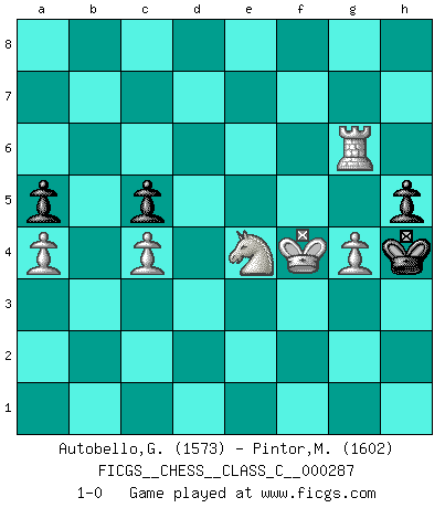 Last move : 1-0 2021 April 20 13:36:55 [Event "FICGS__CHESS__CLASS_C__000287"] [Site "FICGS"] [Date "2020.12.23"] [Round "1"] [White "Autobello,Giovanni"] [Black "Pintor,Manuel"] [Result "1-0"] [WhiteElo "1573"] [BlackElo "1602"] 1.e4 e5 2.Nf3 Nc6 3.Bb5 Bc5 4.O-O Qf6 5.d3 h6 6.Nc3 Nge7 7.Be3 Nd4 8.Kh1 O-O 9.Nd2 c6 10.Bc4 d6 11.f4 exf4 12.Rxf4 Qg6 13.Bxd4 Kh8 14.Bxc5 dxc5 15.Qf3 f5 16.Rf1 Bd7 17.exf5 Rxf5 18.Rxf5 Nxf5 19.Qf2 Nd4 20.Qf8+ Rxf8 21.Rxf8+ Kh7 22.Bg8+ Kh8 23.Bf7 Kh7 24.Bxg6+ Kxg6 25.Nf3 Bg4 26.Ne5+ Kh5 27.Nxg4 Kxg4 28.h3+ Kh5 29.Ne4 b6 30.g4+ Kh4 31.Kh2 Nxc2 32.Rf5 g6 33.Rf6 Ne1 34.Rxg6 Nf3+ 35.Kg2 Ne1+ 36.Kf1 Kxh3 37.Kxe1 Kh4 38.Kf2 h5 39.a4 a5 40.b3 b5 41.Ke3 c4 42.dxc4 bxa4 43.bxa4 c5 44.Kf4 1-0 Ruy Lopez : Classical (Cordel) defense Kingside Castling by player White (move 4) Kingside Castling by player Black (move 8) 10 pieces endgame at move 43 : White KRNPPP , Black KPPP WHITE : King + 1 Rook 1 Knight 3 Pawns BLACK : King + 3 Pawns Player White won this chess game. Follow this game move after move (download)Bobby is the most misunderstood, misquoted celebrity walking the face of this earth. (Yasser Seirawan) Ohne Fehler kann es keine Brillanz geben. (Emanuel Lasker) Bobby es el jugador de Ajedrez mas fino que este país jamás haya producido. Su memoria para las movidas, su brillantez en soñar combinaciones y su feróz determinación por la victoria son algo extraño. (John Collins) Avant la finale, les dieux ont créé le milieu de partie. (Tarrasch) There is a great deal of difference between an eager man who wants to read a book and a tired man who wants a book to read. (G.K. Chesterton)