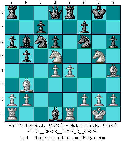Last move : 0-1 2021 March 17 15:17:38 [Event "FICGS__CHESS__CLASS_C__000287"] [Site "FICGS"] [Date "2020.12.23"] [Round "1"] [White "Van Mechelen,Jan"] [Black "Autobello,Giovanni"] [Result "0-1"] [WhiteElo "1715"] [BlackElo "1573"] 1.e4 e5 2.Nf3 Nc6 3.Bb5 a6 4.Ba4 Nf6 5.O-O b5 6.Bb3 Bc5 7.c3 d6 8.d4 exd4 9.cxd4 Bb6 10.Nc3 O-O 11.Bg5 Re8 12.Re1 h6 13.Bh4 Bg4 14.Nd5 g5 15.Nxg5 Bxd1 0-1 Ruy Lopez : 5.O-O Kingside Castling by player White (move 5) Kingside Castling by player Black (move 10) Player Black won this chess game. Follow this game move after move (download)The older I grow, the more I value Pawns. (Keres) Rauchen ist dem Schachspieler bei seiner Arbeit, also im Wettkampf, untersagt. (Viktor Kortschnoi) El Ajedrez es imaginación. (David Bronstein) Dieu déplace le joueur, et celui-ci la pièce. Quel Dieu derrière Dieu commence donc la trame ? Arturo Perez-Reverte (prix de littérature policière 1993). He who is a good ruler must first have been ruled. (Aristotle)