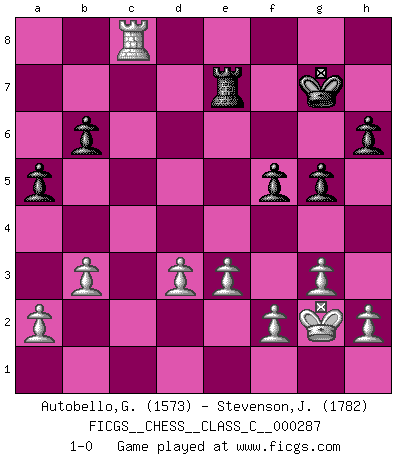 Last move : 1-0 2021 August 16 23:8:39 [Event "FICGS__CHESS__CLASS_C__000287"] [Site "FICGS"] [Date "2020.12.23"] [Round "1"] [White "Autobello,Giovanni"] [Black "Stevenson,John"] [Result "1-0"] [WhiteElo "1573"] [BlackElo "1782"] 1.c4 e5 2.g3 Nf6 3.Bg2 g6 4.Nc3 Bg7 5.Nf3 Nc6 6.O-O O-O 7.d3 d6 8.Bg5 h6 9.Bd2 Be6 10.Rb1 d5 11.cxd5 Nxd5 12.Nxd5 Bxd5 13.b3 f5 14.Bc3 a5 15.Qd2 g5 16.Qb2 Qd7 17.Nxe5 Nxe5 18.Bxe5 Bxg2 19.Bxg7 Qxg7 20.Kxg2 Qxb2 21.Rxb2 Rf7 22.Rc2 Rc8 23.Rfc1 b6 24.Rc6 Kg7 25.Rxb6 cxb6 26.Rxc8 Re7 27.e3 1-0 This chess game has been lost on time (started : 2020.12.23 0:15:19) English Opening Kingside Castling by player White (move 6) Kingside Castling by player Black (move 6) Player White won this chess game. Follow this game move after move (download)I played Chess with him and would have beaten him sometimes only he always took back his last move, and ran the game out differently. (Mark Twain) Das Schachspiel übertrifft alle anderen Spiele so weit wie der Chimborasso einen Misthaufen. (Arthur Schopenhauer) Ayuda a tus piezas para que ellas te puedan ayudar. (Paul Morphy) Les Echecs ont trois composantes : le temps, l'espace et le matériel en dernier. (Mikhail Tal) It is a good thing for an uneducated man to read books of quotations. (Winston Churchill)