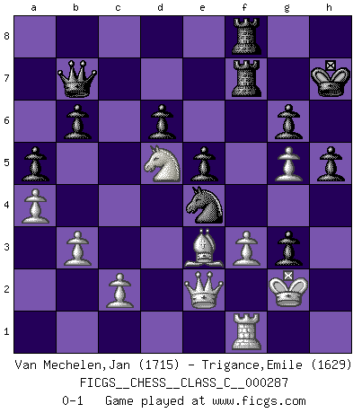 Last move : 0-1 2021 March 11 16:28:28 [Event "FICGS__CHESS__CLASS_C__000287"] [Site "FICGS"] [Date "2020.12.23"] [Round "1"] [White "Van Mechelen,Jan"] [Black "Trigance,Emile"] [Result "0-1"] [WhiteElo "1715"] [BlackElo "1629"] 1.e4 e5 2.Nf3 d6 3.d4 Nf6 4.Nc3 Nbd7 5.Bc4 Be7 6.O-O O-O 7.Re1 c6 8.a4 a5 9.Ba2 Qc7 10.h3 h6 11.Qe2 b6 12.d5 Ba6 13.Qd1 Bb7 14.dxc6 Bxc6 15.Nh4 Kh7 16.Nf5 Nc5 17.Nd5 Nxd5 18.Bxd5 Bf6 19.Re3 g6 20.Rg3 Bg7 21.Ne7 Bxd5 22.Nxd5 Qb7 23.Qe2 f5 24.f3 f4 25.Rg4 h5 26.Rg5 Bh6 27.h4 Bxg5 28.hxg5 Nd7 29.g3 fxg3 30.Be3 Rf7 31.Kg2 Raf8 32.Rf1 Nc5 33.b3 Nxe4 0-1 Philidor : Improved Hanham variation Kingside Castling by player White (move 6) Kingside Castling by player Black (move 6) Player Black won this chess game. Follow this game move after move (download)Only sissies Castle. (Rob Sillars) Ich könnte leicht behaupten: Ja,ja, Leonid Breschnew wollte nicht, daß ich Weltmeister werde. In der Tat war die Sache komplizierter. (Viktor Kortschnoi) Aquel que teme a un Peón de Reina aislado, debería de retirarse del Ajedrez. (Siegbert Tarrasch) Si le désir cupide (et stupide) de gagner est une inépuisable source de souffrance, une combinaison brillante sur l'échiquier est une découverte : le coquelicot qui s'épanouit lorsque apparaît la Voie Lactée. (Arrabal) A specialist learns more and more about less and less until he knows everything about nothing. (Nicholas Murray Butler)