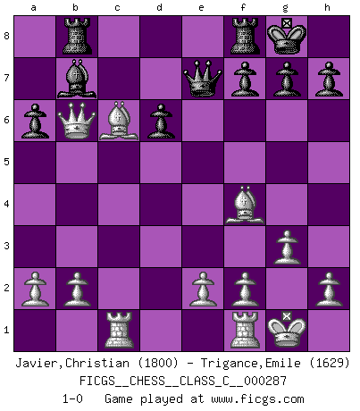 Last move : 1-0 2021 February 16 8:34:11 [Event "FICGS__CHESS__CLASS_C__000287"] [Site "FICGS"] [Date "2020.12.23"] [Round "1"] [White "Javier,Christian"] [Black "Trigance,Emile"] [Result "1-0"] [WhiteElo "1800"] [BlackElo "1629"] 1.d4 Nf6 2.c4 e6 3.Nf3 b6 4.g3 Bb7 5.Bg2 Be7 6.O-O O-O 7.d5 exd5 8.Nh4 c6 9.cxd5 cxd5 10.Nc3 Re8 11.Nf5 d6 12.Bf4 a6 13.Nxd5 Nxd5 14.Bxd5 Nc6 15.Rc1 Rc8 16.Qb3 Rf8 17.Nxe7+ Qxe7 18.Qxb6 Rb8 19.Bxc6 1-0 Queen's Indian : Old Main line, 6.O-O Kingside Castling by player White (move 6) Kingside Castling by player Black (move 6) Player White won this chess game. Follow this game move after move (download)A bad day of Chess is better than any good day at work. (Anonymous) Unter Putin wird alles Geld aus Russland wie von einem Staubsauger nach Moskau umgeleitet, das ist wie ein schwarzes Loch. (Garry Kasparov) Juega la Apertura como un libro, el Juego Medio como un mago y los Finales como una máquina. (Spielmann) La vie est comme un jeu d'échecs : nous esquissons un plan, mais celui-ci est tributaire de ce que daignent faire l'adversaire aux échecs et le destin dans la vie. (Arthur Schopenhauer) In every real man a child is hidden that wants to play. (Friedrich Nietzsche)