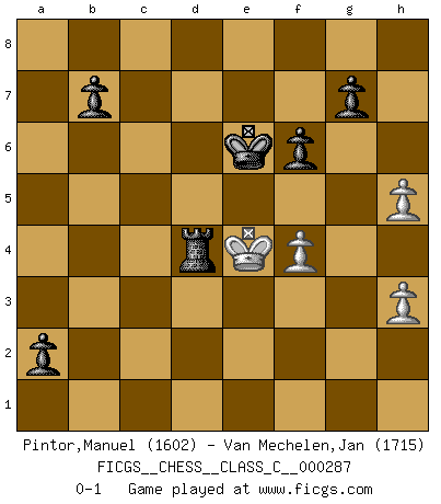 Last move : 0-1 2021 January 20 16:24:37 [Event "FICGS__CHESS__CLASS_C__000287"] [Site "FICGS"] [Date "2020.12.23"] [Round "1"] [White "Pintor,Manuel"] [Black "Van Mechelen,Jan"] [Result "0-1"] [WhiteElo "1602"] [BlackElo "1715"] 1.e4 e6 2.f4 d5 3.exd5 exd5 4.d4 Bd6 5.Nf3 Ne7 6.Bd3 Bf5 7.Ne5 Bxd3 8.Qxd3 f6 9.Nf3 Qd7 10.O-O Nbc6 11.Qb3 O-O-O 12.Nc3 Bb4 13.Na4 Nf5 14.c3 Be7 15.Nc5 Bxc5 16.dxc5 Rhe8 17.Nd4 Ncxd4 18.cxd4 Nxd4 19.Qd3 Nf5 20.Bd2 Re4 21.Rae1 Rde8 22.b4 Qe6 23.Rxe4 dxe4 24.Qb3 Qxb3 25.axb3 Rd8 26.Be1 h5 27.Rf2 Rd1 28.Kf1 Rb1 29.Re2 e3 30.h3 Rxb3 31.g4 Nd4 32.gxh5 Nxe2 33.Kxe2 Kd7 34.b5 Ke6 35.Ba5 Rxb5 36.Bxc7 Rxc5 37.Bb8 a5 38.Kxe3 a4 39.Kd4 Rc8 40.Ba7 a3 41.Kd3 a2 42.Bd4 Rd8 43.Ke4 Rxd4+ 0-1 French : Labourdonnais variation Kingside Castling by player White (move 10) Queenside Castling by player Black (move 11) 10 pieces endgame at move 43 : White KPPP , Black KRPPPP WHITE : King + 3 Pawns BLACK : King + 1 Rook 4 Pawns Player Black won this chess game. Follow this game move after move (download)Let the perfectionist play postal. (Yasser Seirawan) Um sich vor der Gefahr einer Erkältung zu schützen, sorge der wanderlustige König beizeiten für ein brauchbares Versteck. (Aaron Nimzowitsch) Desconfianza es la característica mas necesaria de un jugador de Ajedrez. (Siegbert Tarrasch) Aucun coup ne doit être joué sans but. (Pedro Damiano) An expert is a man who has made all the mistakes which can be made in a very narrow field. (Niels Bohr)