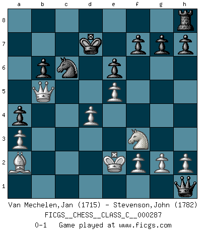 Last move : 0-1 2021 March 28 12:52:32 [Event "FICGS__CHESS__CLASS_C__000287"] [Site "FICGS"] [Date "2020.12.23"] [Round "1"] [White "Van Mechelen,Jan"] [Black "Stevenson,John"] [Result "0-1"] [WhiteElo "1715"] [BlackElo "1782"] 1.e4 c5 2.a3 e6 3.b4 d5 4.e5 b6 5.c3 a5 6.b5 a4 7.d4 c4 8.Nd2 Bd7 9.Rb1 Ra5 10.Nxc4 dxc4 11.Bxc4 Qc8 12.Qd3 Ne7 13.Ba2 Nd5 14.c4 Nc7 15.Bg5 Be7 16.Bxe7 Kxe7 17.Nf3 Nxb5 18.cxb5 Bxb5 19.Rxb5 Rxb5 20.Qxb5 Qc1+ 21.Ke2 Qxh1 22.Qb4+ Kd7 23.Qb5+ Nc6 0-1 Sicilian defense Player Black won this chess game. Follow this game move after move (download)Whoever sees no other aim in the game than that of giving checkmate to one's opponent will never become a good Chess player. (Euwe) Wenn ich Weiß habe gewinne ich weil ich Weiß habe, wenn ich Schwarz habe gewinne ich weil ich Bogoljubov bin. (Efim Bogoljubov) Fischer es el jugador mas fuerte del mundo. De hecho, el jugador mas fuerte que jamas haya existido. (Larry Evans) Vous m'avez demandé de vous exposer quel est le fondement de la prière. Je ne fais que préparer les pièces du jeu sur la table... Nous sera-t-il permis d'en adopter les règles et si nous les appliquons scrupuleusement nous ne tarderons pas à faire mat le Roi divin ! Il ne pourra échapper à nos mains. (Sainte Thérèse d'Avila, Chemin de perfection) 98% of all statistics are made up. (Author unknown)