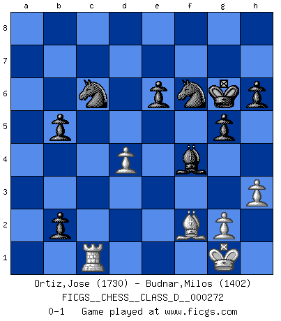 Last move : 0-1 2021 June 8 23:29:38 [Event "FICGS__CHESS__CLASS_D__000272"] [Site "FICGS"] [Date "2020.12.23"] [Round "1"] [White "Ortiz,Jose"] [Black "Budnar,Milos"] [Result "0-1"] [WhiteElo "1730"] [BlackElo "1402"] 1.e4 e5 2.Bc4 Nf6 3.d3 h6 4.a3 Bd6 5.b4 O-O 6.Ne2 c5 7.Bd2 Nc6 8.O-O a6 9.c3 b5 10.Bb3 Qb6 11.h3 cxb4 12.axb4 Bc7 13.Ng3 d6 14.Be3 Qb8 15.f4 exf4 16.Bxf4 Be6 17.Qc2 Bxb3 18.Qxb3 Qe8 19.Nd2 Qe6 20.Qb2 a5 21.Kh1 axb4 22.Nf3 g5 23.Be3 b3 24.Rxa8 Rxa8 25.Nf5 Kh7 26.Re1 Ra2+ 27.N3d4 Rxb2 28.Nxe6 fxe6 29.e5 dxe5 30.Ng3 Rc2 31.d4 exd4 32.cxd4 Bxg3 33.Rf1 Kg6 34.Kg1 b2 35.Rb1 Bf4 36.Bf2 Rc1+ 37.Rxc1 bxc1+Q 0-1 Bishop's Opening : Berlin defense Kingside Castling by player Black (move 5) Kingside Castling by player White (move 8) Promotion Queen by player Black (move 37) Follow this game move after move (download)Chess is the art of analysis. (Mikhail Botvinnik) Wenn ein Kopf und ein Buch zusammenstoßen und es klingt hohl, ist es denn allemal im Buche? (Georg Christoph Lichtenberg) El Ajedrez es el arte del análisis. (Mikhail Botvinnik) La guerre est enfant de la passion, la passion est enfant du narcissisme et le narcissisme est l'enfant. (...) Une autre partie ? (Thibault de Vassal) True nature is revealed in times of difficulty. (Chinese proverb)
