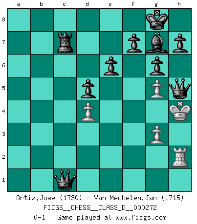 Last move : 0-1 2021 July 5 21:10:33 [Event "FICGS__CHESS__CLASS_D__000272"] [Site "FICGS"] [Date "2020.12.23"] [Round "1"] [White "Ortiz,Jose"] [Black "Van Mechelen,Jan"] [Result "0-1"] [WhiteElo "1730"] [BlackElo "1715"] 1.Nf3 Nf6 2.d4 g6 3.Bg5 Bg7 4.Nc3 d5 5.e3 O-O 6.Bd3 c5 7.O-O cxd4 8.exd4 Nc6 9.Re1 Bg4 10.Be2 e6 11.Ne5 Bxe2 12.Rxe2 Rc8 13.a3 Qd6 14.Nb5 Qd8 15.Qd2 a6 16.Nxc6 Rxc6 17.b4 axb5 18.h4 Qc7 19.Rc1 Ne4 20.Qd3 Rc3 21.Qd1 Nxg5 22.hxg5 Rxa3 23.Re3 Rxe3 24.fxe3 Qc3 25.Qe2 Qxb4 26.g3 Qc4 27.Qf2 b4 28.Kh2 b3 29.Qd2 Rc8 30.c3 b5 31.Kh3 b4 32.Kg4 bxc3 33.Qf2 c2 34.Ra1 b2 35.Rf1 Rc7 36.Qf4 c1Q 37.Rf2 b1Q 38.Qf3 Qf5+ 39.Kh4 Qxf3 40.Rh2 Qxd4+ 41.exd4 Qh5+ 0-1 Reti Opening Kingside Castling by player Black (move 5) Kingside Castling by player White (move 7) Promotion Queen by player Black (move 36) Promotion Queen by player Black (move 37) Player Black won this chess game. Follow this game move after move (download)A thorough understanding of the typical mating continuations makes the most complicated sacrificial combinations leading up to them not only not difficult, but almost a matter of course. (Siegbert Tarrasch) Ein Großmeister muß tausende Partien in seinem Kopf speichern, denn diese sind für Ihn, was die Worte der Muttersprache für gewöhnliche Leute sind, oder Noten für Musiker... (Garry Kasparov) El Ajedrez moderno está demasiado preocupado con cosas como la estructura de Peones. Olvidenlo, el Jaque Mate termina la partida. (Nigel Short) Seul un grand joueur sait à quel point il joue faiblement. (Xavier Tartacover) If you don't practice you don't deserve to win. (Andre Agassi)