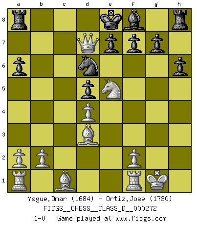 Last move : 1-0 2021 March 22 20:28:4 [Event "FICGS__CHESS__CLASS_D__000272"] [Site "FICGS"] [Date "2020.12.23"] [Round "1"] [White "Yague,Omar"] [Black "Ortiz,Jose"] [Result "1-0"] [WhiteElo "1684"] [BlackElo "1730"] 1.d4 Nf6 2.Nf3 d5 3.e3 Bg4 4.c4 c6 5.h3 Bh5 6.Be2 Nbd7 7.O-O h6 8.cxd5 cxd5 9.Bd3 a6 10.g4 Nxg4 11.hxg4 Bxg4 12.e4 Nf6 13.e5 Ne4 14.e6 Bxe6 15.Ne5 Qd6 16.Nc3 Bf5 17.Qa4+ b5 18.Nxb5 Bd7 19.Nxd6+ Nxd6 20.Qxd7+ 1-0 Queen's pawn game Kingside Castling by player White (move 7) Player White won this chess game. Follow this game move after move (download)Nowadays, when you're not a grandmaster at 14, you can forget about it. (Anand Viswanathan) Man kann eine Schachpartie nur gewinnen, wenn das Gleichgewicht gestört ist. In einer Stellung mit ungestörtem Gleichgewicht ist auch das größte Genie hilflos - in der Stellung steckt dann eben kein genialer Einfall. (Wilhelm Steinitz) Realmente no sabemos como el juego fue inventado, aunque hay sospechas. Tan pronto como descubramos a los culpables, se los haremos saber. (Bruce Pandolfini) Les Echecs ont trois composantes : le temps, l'espace et le matériel en dernier. (Mikhail Tal) I've never seen so many men wasted so badly. (Blondie in The Good, The Bad and The Ugly)
