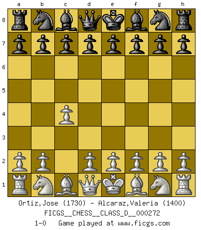 Last move : 1-0 2021 February 1 2:13:23 [Event "FICGS__CHESS__CLASS_D__000272"] [Site "FICGS"] [Date "2020.12.23"] [Round "1"] [White "Ortiz,Jose"] [Black "Alcaraz,Valeria"] [Result "1-0"] [WhiteElo "1730"] [BlackElo "1400"] 1.c4 1-0 This chess game has been lost on time (started : 2020.12.23 0:15:48) English Opening Player White won this chess game. Follow this game move after move (download)The Pawns are the soul of the game. (Francois Andre Danican Philidor) Ich rechne überhaupt nicht voraus. Ich gewinne auch so. (Robert James Fischer) Por la belleza de sus partidas, la claridad de su juego y lo brillante de sus ideas, Fischer se creó el mismo como un artista de la misma estatura como Brahms, Rembrandt y Shakespeare. (David Levy) Le système Elo représente seulement une moyenne. Il est simplement un indicateur de votre stabilité. (Anatoli Karpov) Strategy without tactics is the slowest route to victory. Tactics without strategy is the noise before defeat. (Sun Tzu)