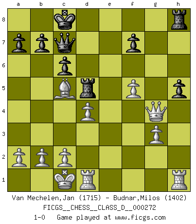 Last move : 1-0 2021 January 17 14:53:30 [Event "FICGS__CHESS__CLASS_D__000272"] [Site "FICGS"] [Date "2020.12.23"] [Round "1"] [White "Van Mechelen,Jan"] [Black "Budnar,Milos"] [Result "1-0"] [WhiteElo "1715"] [BlackElo "1402"] 1.e4 e5 2.f4 exf4 3.Nf3 g5 4.Nc3 d6 5.g3 g4 6.Nh4 Be7 7.Nf5 Bxf5 8.exf5 Nf6 9.d4 f3 10.h3 h5 11.hxg4 Nxg4 12.Qxf3 c6 13.Bf4 Nd7 14.O-O-O Qb6 15.Ne4 O-O-O 16.Nxd6+ Bxd6 17.Bxd6 Ndf6 18.Bc5 Qc7 19.Bc4 Nd5 20.Bxd5 Rxd5 21.Qxg4 1-0 KGA : Quaade gambit Queenside Castling by player White (move 14) Queenside Castling by player Black (move 15) Player White won this chess game. Follow this game move after move (download)One bad move nullifies forty good ones. (Horowitz) Wer der Ansicht ist, daß alle Schachspieler verrückt sind, wird durch Studium des Lebens von Emil Josef Diemer nicht auf andere Gedanken kommen. (Hans Ree) Una mala movida nulifica cuarenta buenas. (Horowitz) On entre au jeu d'Echecs comme on entre en Religion. Pour le joueur d'Echecs, la partie d'Echecs c'est l'office, la messe, le défilé du 1er Mai, le dépôt de gerbe au Monument aux Morts. C'est un drame sacré. (Michel Roos) Vladimir Ras-Putin is still alive... He is also a good actor, I saw him in the Lord of the Rings. (Rodolfo d'Ettorre)