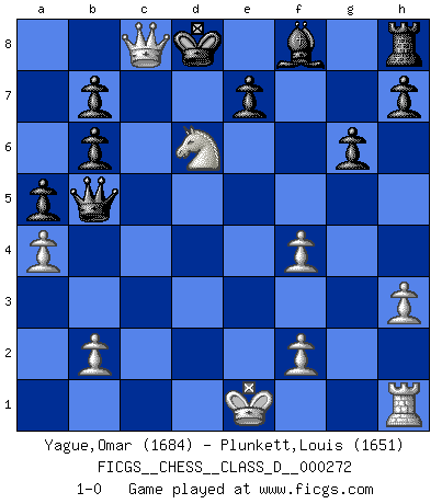 Last move : 1-0 2021 April 6 0:33:0 [Event "FICGS__CHESS__CLASS_D__000272"] [Site "FICGS"] [Date "2020.12.23"] [Round "1"] [White "Yague,Omar"] [Black "Plunkett,Louis"] [Result "1-0"] [WhiteElo "1684"] [BlackElo "1651"] 1.d4 d5 2.c4 Nf6 3.Nf3 Nc6 4.cxd5 Nxd5 5.e4 Nf6 6.d5 Nb8 7.Nc3 Bg4 8.Qb3 Nbd7 9.h3 Bxf3 10.gxf3 Ne5 11.Be2 Qc8 12.f4 Ned7 13.e5 Ng8 14.e6 fxe6 15.dxe6 Nb6 16.a4 a5 17.Be3 Nf6 18.Rc1 Qd8 19.Bxb6 cxb6 20.Bb5+ Nd7 21.Ne4 g6 22.exd7+ Qxd7 23.Qe6 Qxb5 24.Rc8+ Rxc8 25.Nd6+ Kd8 26.Qxc8+ 1-0 QGD : Marshall defense Player White won this chess game. Follow this game move after move (download)Chess makes man wiser and clear-sighted. (Vladimir Putin) Ich habe kein Problem mit Frauen, sondern nur mit dem Niveau ihres Schachspiels (Judith Polgar) Creo que una cierta cantidad de temperamento es esperada de los genios del Ajedrez. (Ron Gross) La victoire dans une partie d'Echecs appartient la plupart du temps à celui qui voit un peu plus loin que l'adversaire. (Lasker) Patience, use the Force, think ! (Obi-Wan Kenobi in Star Wars ep.2)