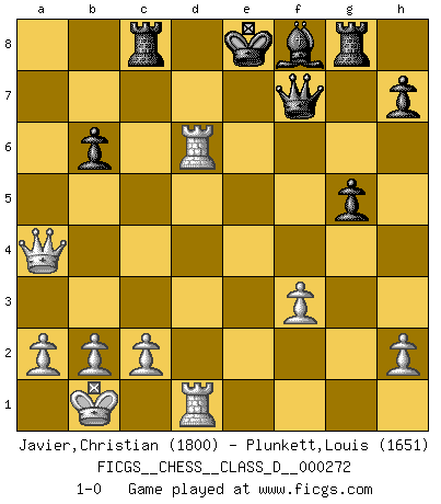 Last move : 1-0 2021 June 6 14:26:54 [Event "FICGS__CHESS__CLASS_D__000272"] [Site "FICGS"] [Date "2020.12.23"] [Round "1"] [White "Javier,Christian"] [Black "Plunkett,Louis"] [Result "1-0"] [WhiteElo "1800"] [BlackElo "1651"] 1.e4 c5 2.Nf3 Nc6 3.d4 cxd4 4.Nxd4 Nf6 5.Nc3 d6 6.Bg5 e5 7.Bxf6 Qxf6 8.Ndb5 Kd8 9.Nd5 Qg6 10.Qd3 f5 11.O-O-O fxe4 12.Qb3 Bg4 13.f3 exf3 14.gxf3 Bf5 15.Bd3 Bxd3 16.Rxd3 Rc8 17.Kb1 Nd4 18.Nxd4 exd4 19.Nf4 Qf6 20.Nd5 Qf7 21.Rxd4 g5 22.Qa3 b6 23.Rhd1 Rg8 24.Nxb6 axb6 25.Rxd6+ Ke8 26.Qa4+ 1-0 Sicilian defense Queenside Castling by player White (move 11) Player White won this chess game. Follow this game move after move (download)A passed Pawn increases in strength as the number of pieces on the board diminishes. (Capablanca) Ich bin stolz ein Bulgare zu sein. (Veselin Topalov) Una de estas pequeñas movidas modestas pudieran ser mas molestas a tu oponente que la amenaza mas grande. (Siegbert Tarrasch) Aidez vos pièces, elles vous aideront. (Paul Morphy) A good aphorism is too hard for the tooth of time, and is not worn away with the centuries, although it serves as food for every speech. (Friedrich Nietzsche)