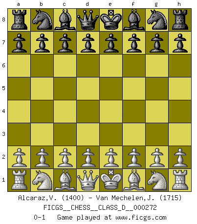 Last move : 0-1 2021 February 1 2:13:23 [Event "FICGS__CHESS__CLASS_D__000272"] [Site "FICGS"] [Date "2020.12.23"] [Round "1"] [White "Alcaraz,Valeria"] [Black "Van Mechelen,Jan"] [Result "0-1"] [WhiteElo "1400"] [BlackElo "1715"] 0-1 This chess game has been lost on time (started : 2020.12.23 0:15:48) Player Black won this chess game. Follow this game move after move (download)Weak points or holes in the opponent's position must be occupied by pieces not Pawns. (Siegbert Tarrasch) Bogoljubow: Matt in vier Zügen! Tartakower: Ich verbitte mir jede Belästigung! (Savielly Grigorievitsch Tartakower) En el Ajedrez, tal como en la vida, las bendiciones de hoy pueden ser el veneno del mañana. (Assaic) La conception d'un plan est le processus par lequel un joueur exploite les avantages de sa position tout en s'efforçant d'en réduire au minimum les inconvénients. Afin de garantir le succès, un plan doit toujours se fonder sur un diagnostic objectif des particularités d'une position. La conception d'un plan est d'autant plus difficile que la position est équilibrée, et grandement facilitée lorsqu'il n'existe qu'un seul plan susceptible de répondre aux exigences de la position. (Harry Golombek) They misunderestimated me. (George W. Bush, Bentonville nov. 6, 2000)
