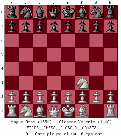 Last move : 1-0 2021 February 1 15:29:23 [Event "FICGS__CHESS__CLASS_D__000272"] [Site "FICGS"] [Date "2020.12.23"] [Round "1"] [White "Yague,Omar"] [Black "Alcaraz,Valeria"] [Result "1-0"] [WhiteElo "1684"] [BlackElo "1400"] 1.Nf3 1-0 This chess game has been lost on time (started : 2020.12.23 0:15:48) Reti Opening Player White won this chess game. Follow this game move after move (download)Chess is mental torture. (Garry Kasparov) Wer mein Gambit spielt, muß bereit sein, alle Brücken hinter sich abzubrechen. Es verändert den ganzen Menschen. Es wirkt wie ein Zauberstab und fördert verkümmerte, gute Charakter- eigenschaften wieder zu Tage. (Emil Joseph Diemer) A la fecha, Fischer esta simplemente un nivel arriba de todos los mejores jugadores de Ajedrez del mundo. (John Jacobs) Les écrivains ont utilisé les échecs pour analyser les côtés extrêmes de la nature humaine. Dans ce cadre, les échecs offrent un champ d'expérimentation idéal. Mais on pourrait faire la même chose avec la peinture. Et là, en vous référant à Van Gogh, vous ne tirerez pas de conclusion définitive sur les peintres. (Gary Kasparov) Chess is everything: art, science and sport. (Anatoly Karpov)