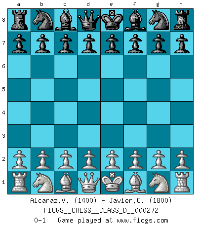 Last move : 0-1 2021 February 1 2:13:23 [Event "FICGS__CHESS__CLASS_D__000272"] [Site "FICGS"] [Date "2020.12.23"] [Round "1"] [White "Alcaraz,Valeria"] [Black "Javier,Christian"] [Result "0-1"] [WhiteElo "1400"] [BlackElo "1800"] 0-1 This chess game has been lost on time (started : 2020.12.23 0:15:48) Player Black won this chess game. Follow this game move after move (download)With or without the title, Bobby Fischer was unquestionably the greatest player of his time. (Burt Hochberg) Ich verachte die Medien. (Robert James Fischer) Mis oponentes también hacen buenas movidas. A veces yo no tomo esas cosas en consideración. (Bobby Fischer) La guerre est enfant de la passion, la passion est enfant du narcissisme et le narcissisme est l'enfant. (...) Une autre partie ? (Thibault de Vassal) Man with more than one clock never knows what time it is. (Chinese thought)