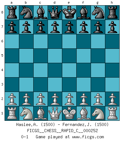 Last move : 0-1 2021 January 22 7:13:9 [Event "FICGS__CHESS__RAPID_C__000252"] [Site "FICGS"] [Date "2020.12.23"] [Round "1"] [White "Haslee,Adee"] [Black "Fernandez,Juan Carlos"] [Result "0-1"] [WhiteElo "1500"] [BlackElo "1500"] 0-1 This chess game has been lost on time (started : 2020.12.23 2:7:44) Player Black won this chess game. Follow this game move after move (download)Chess, like love, like music, has the power to make people happy. (Siegbert Tarrasch) Die Leute spielen gegen mich seit 15 Jahren unter Ihren Möglichkeiten. (Robert James Fischer) En el tablero, la mentira e hipocresía no sobreviven mucho. (Emanuel Lasker) On entre au jeu d'Echecs comme on entre en Religion. Pour le joueur d'Echecs, la partie d'Echecs c'est l'office, la messe, le défilé du 1er Mai, le dépôt de gerbe au Monument aux Morts. C'est un drame sacré. (Michel Roos) If we knew what we were doing, we would not call it research. (Albert Einstein)