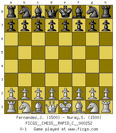 Last move : 0-1 2021 January 22 7:13:9 [Event "FICGS__CHESS__RAPID_C__000252"] [Site "FICGS"] [Date "2020.12.23"] [Round "1"] [White "Fernandez,Juan Carlos"] [Black "Nuray,Shakir"] [Result "0-1"] [WhiteElo "1500"] [BlackElo "1500"] 0-1 This chess game has been lost on time (started : 2020.12.23 2:7:44) Player Black won this chess game. Follow this game move after move (download)Openings teach you openings. Endgames teach you chess ! (Stephan Gerzadowicz) Ein Teil des Fehlers ist immer korrekt. (Savielly Grigorievitsch Tartakower) Dejen al perfeccionista jugar por correo. (Yasser Seirawan) Karpov est une pièce de musée. (Garry Kasparov) You lose, general Kenobi. (General Grievous in Star Wars ep.3)