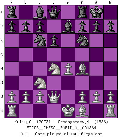 Last move : 0-1 2021 February 1 15:29:23 [Event "FICGS__CHESS__RAPID_A__000264"] [Site "FICGS"] [Date "2020.12.25"] [Round "1"] [White "Kuliy,Oleksandr"] [Black "Schangareev,Mirzian"] [Result "0-1"] [WhiteElo "2073"] [BlackElo "1926"] 1.e4 e5 2.Nf3 d6 3.d4 exd4 4.Nxd4 Nf6 5.Nc3 Be7 6.Bf4 O-O 7.Qd2 Nc6 0-1 This chess game has been lost on time (started : 2020.12.25 12:11:2) Philidor : Exchange variation Kingside Castling by player Black (move 6) Player Black won this chess game. Follow this game move after move (download)The battle for the ultimate truth will never be won. And that's why Chess is so fascinating. (Hans Kmoch) Bobby Fischer ist kein Vorbild für die heutige Jugend. (Viktor Kortschnoi) Robert Fischer es la ley hacia si mismo. (Larry Evans) Botvinnik disait en comparant les échecs à la musique: Il existe une science dont le but est l'étude de l'acoustique et des sons. Mais il y a aussi un art qui se sert de l'océan des sons : c'est la musique. De toute évidence, il en est de même pour la pensée. La logique est l'étude des lois de la réflexion et les échecs reflètent, en tant qu'art, le côté logique de la réflexion, sous la forme d'images artistiques... Extrait de Fischer - Spassky, Reykjavik 1972 par Alexander & F. Wyndham (Ed. Solar), p 37. It's not the will to win, but the will to prepare to win that makes the difference. (Bear Bryant)