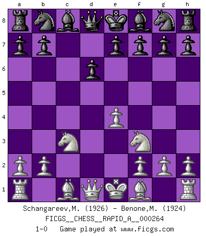 Last move : 1-0 2021 January 31 14:10:57 [Event "FICGS__CHESS__RAPID_A__000264"] [Site "FICGS"] [Date "2020.12.25"] [Round "1"] [White "Schangareev,Mirzian"] [Black "Benone,Mateia"] [Result "1-0"] [WhiteElo "1926"] [BlackElo "1924"] 1.Nf3 c5 2.d4 cxd4 3.c3 dxc3 4.Nxc3 d6 5.e4 1-0 This chess game has been lost on time (started : 2020.12.25 12:11:2) Reti Opening Player White won this chess game. Follow this game move after move (download)Many have become Chess Masters, no one has become the Master of Chess. (Siegbert Tarrasch) Ohne Leiden bildet sich kein Charakter. (Ernst Freiherr von Feuchtersleben) Nunca antes ha habido un jugador de Ajedrez con tal conocimiento a fondo de las complejidades del juego y una inmensa voluntad absolutamente indomable de ganar. Yo pienso que Fischer es el jugador mas grande que jamás haya existido. (Lisa Lane) Les échecs c'est le défi de l'alpiniste, toujours plus haut, prêt à tout pour monter à l'assaut du Roi ennemi. Les échecs, c'est de la musique en mouvement, un ballet majestueux pour les yeux. C'est de la poésie composée par les fantômes du passé qui au même titre que Rimbaud ou Verlaine méritent notre admiration. Les échecs, c'est de la peinture ou le moindre mouvement modifie le tableau pour en faire un Picasso ou un Van Gogh. Les échecs, c'est tout et rien, c'est la vie et la mort. Jjulie33 sur le forum de France-Echecs. Vladimir Ras-Putin is still alive... He is also a good actor, I saw him in the Lord of the Rings. (Rodolfo d'Ettorre)