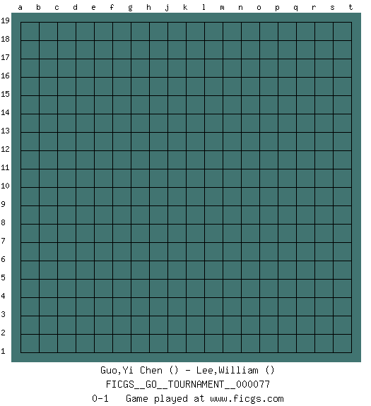 Last move : 0-1 2021 January 26 13:45:7 [Event "FICGS__GO__TOURNAMENT__000077"] [Site "FICGS"] [Date "2020.12.26"] [Round "1"] [Black "Guo,Yi Chen"] [White "Lee,William"] [Result "0-1"] 0-1 This go game has been lost on time (started : 2020.12.26 22:1:35) Here are the names of the openings (joseki) played in the four corners : Player White won this Go (weiqi, baduk) game. Follow this game move after move (download)A knight's move near the edge of the board cannot be cut. (Bill Taylor) What doesn't kill us makes us stronger. (Friedrich Nietzsche)