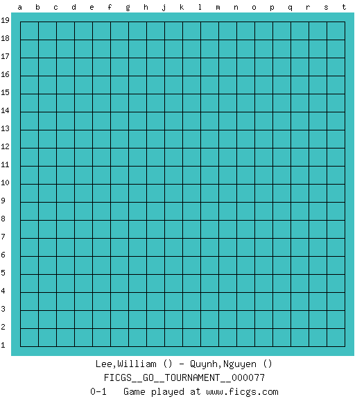 Last move : 0-1 2021 January 26 13:45:7 [Event "FICGS__GO__TOURNAMENT__000077"] [Site "FICGS"] [Date "2020.12.26"] [Round "1"] [Black "Lee,William"] [White "Quynh,Nguyen"] [Result "0-1"] 0-1 This go game has been lost on time (started : 2020.12.26 22:1:35) Here are the names of the openings (joseki) played in the four corners : Player White won this Go (weiqi, baduk) game. Follow this game move after move (download)To reduce an opponent's large prospective territory, strike at the shoulder. (Anonymous) The Internet is so big, so powerful and pointless that for some people it is a complete substitute for life. (Andrew Brown)
