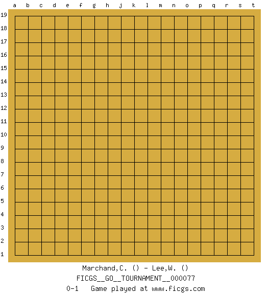 Last move : 0-1 2021 January 26 13:45:7 [Event "FICGS__GO__TOURNAMENT__000077"] [Site "FICGS"] [Date "2020.12.26"] [Round "1"] [Black "Marchand,Christopher"] [White "Lee,William"] [Result "0-1"] 0-1 This go game has been lost on time (started : 2020.12.26 22:1:35) Here are the names of the openings (joseki) played in the four corners : Player White won this Go (weiqi, baduk) game. Follow this game move after move (download)You don't have to be really good anymore to get good results. What's happening with chess is that it's gradually losing its place as the par excellence of intellectual activity. Smart people in search of a challenging board game might try a game called Go. (Hans Berliner, The New York Times, 2003) Fortune favours the audacious. (Desiderius Erasmus)