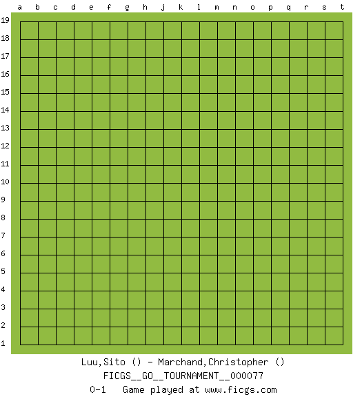 Last move : 0-1 2021 January 26 13:45:7 [Event "FICGS__GO__TOURNAMENT__000077"] [Site "FICGS"] [Date "2020.12.26"] [Round "1"] [Black "Luu,Sito"] [White "Marchand,Christopher"] [Result "0-1"] 0-1 This go game has been lost on time (started : 2020.12.26 22:1:35) Here are the names of the openings (joseki) played in the four corners : Player White won this Go (weiqi, baduk) game. Follow this game move after move (download)Conservative and slow will win. Believe it ! (Anonymous) Who needs drugs and alcohol if he can play Big Chess at FICGS ? (Heinz-Georg Lehnhoff)