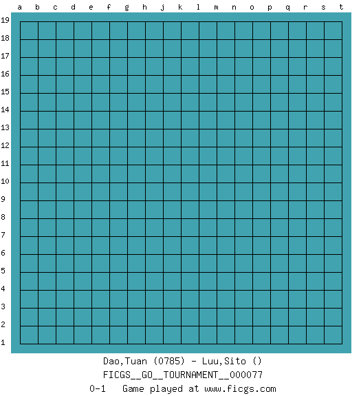 Last move : 0-1 2021 January 26 13:45:7 [Event "FICGS__GO__TOURNAMENT__000077"] [Site "FICGS"] [Date "2020.12.26"] [Round "1"] [Black "Dao,Tuan"] [White "Luu,Sito"] [Result "0-1"] [Rating 1 "0785"] 0-1 This go game has been lost on time (started : 2020.12.26 22:1:35) Here are the names of the openings (joseki) played in the four corners : Player White won this Go (weiqi, baduk) game. Follow this game move after move (download)Stop on second, extend on third. (Anonymous) To err is human, but to really foul things up requires a computer. (Farmer's Almanac, 1978)