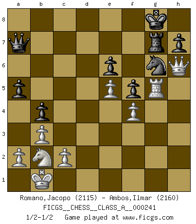 Last move : 1/2-1/2 2021 March 14 11:3:41 [Event "FICGS__CHESS__CLASS_A__000241"] [Site "FICGS"] [Date "2020.12.27"] [Round "1"] [White "Romano,Jacopo"] [Black "Ambos,Ilmar"] [Result "1/2-1/2"] [WhiteElo "2115"] [BlackElo "2160"] 1.e4 c5 2.Nf3 e6 3.d4 cxd4 4.Nxd4 Nc6 5.Nc3 Qc7 6.Be3 a6 7.Qd2 Nf6 8.O-O-O Be7 9.f3 b5 10.g4 Nxd4 11.Bxd4 b4 12.Na4 Rb8 13.Kb1 O-O 14.Qf2 d5 15.g5 Nh5 16.Bb6 Qc6 17.b3 Bxg5 18.Bc5 Re8 19.Rg1 Bd8 20.Qd2 g6 21.Qh6 Kh8 22.Bd3 Rb7 23.Bd4+ Bf6 24.Bxf6+ Nxf6 25.e5 Ng8 26.Qf4 a5 27.h4 f5 28.h5 gxh5 29.Qg5 Rf7 30.Rg2 Ref8 31.Qxh5 Bd7 32.Rdg1 Be8 33.Qh4 Ne7 34.Be2 Rg8 35.f4 Rxg2 36.Rxg2 d4 37.Rg1 d3 38.Bxd3 Qc7 39.Qg5 Ng6 40.Qh6 Rg7 41.Nb2 Qc5 42.Qh2 Bc6 43.Bc4 Bd5 44.Nd3 Qd4 45.Bxd5 Qxd5 46.Qh6 Kg8 47.Nb2 Qc5 48.Rg5 Qa7 1/2-1/2 Sicilian : Taimanov variation Queenside Castling by player White (move 8) Kingside Castling by player Black (move 13) This chess game ended in a draw. Follow this game move after move (download)Chess teaches you to control the initial excitement you feel when you see something that looks good and it trains you to think objectively when you're in trouble. (Stanley Kubrick) Wie, soll nun auch die Opposition abgeschafft werden? Ja, es tut mir leid, Ihnen diesen Schmerz nicht ersparen zu können. (Aaron Nimzowitsch) Cuando tu casa esta en llamas, no puedes ser molestado por tus vecinos. O, como decinos en Ajedrez, si tu Rey esta bajo ataque, no te preocupa perder un Peón del lado de la Reina. (Gary Kasparov) La menace est plus forte que l'exécution. (Aaron Nimzovitch) Without deviation from the norm, progress is not possible. (Frank Zappa)