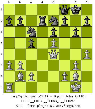 Last move : 0-1 2021 May 6 12:48:53 [Event "FICGS__CHESS__CLASS_A__000241"] [Site "FICGS"] [Date "2020.12.27"] [Round "1"] [White "Jempty,George"] [Black "Dyson,John"] [Result "0-1"] [WhiteElo "2061"] [BlackElo "2110"] 1.e4 c6 2.Nc3 d5 3.Nf3 Bg4 4.h3 Bxf3 5.Qxf3 e6 6.g3 Nf6 7.Bg2 Bb4 8.a3 Bxc3 9.Qxc3 dxe4 10.b3 Qe7 11.Bb2 c5 12.d3 Nc6 13.dxe4 O-O 14.e5 Nd5 15.Qc4 Rad8 16.O-O Rd7 17.Rfd1 Rfd8 18.h4 g6 19.Qe4 Qf8 20.Rd3 Nde7 21.Rxd7 Rxd7 0-1 Caro-Kann : Two knights, 3...Bg4 Kingside Castling by player Black (move 13) Kingside Castling by player White (move 16) Player Black won this chess game. Follow this game move after move (download)Whoever sees no other aim in the game than that of giving checkmate to one's opponent will never become a good Chess player. (Euwe) Ich glaube nicht an Psychologie, ich glaube an gute Züge. (Robert James Fischer) Los asuntos humanos son como una partida de Ajedrez: solo aquellos que no lo toman seriamente, pueden ser llamados buenos jugadores. (Hung Tzu Ch'eng) Le moment que je préfère le plus dans une rencontre, c'est celui où je sens que la personnalité de l'adversaire se brise. (Robert Fischer) Dave, my mind is going. I can feel it. (HAL 9000 in 2001, a space odyssey)