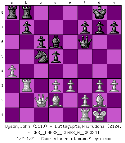 Last move : 1/2-1/2 2021 May 13 15:49:19 [Event "FICGS__CHESS__CLASS_A__000241"] [Site "FICGS"] [Date "2020.12.27"] [Round "1"] [White "Dyson,John"] [Black "Duttagupta,Aniruddha"] [Result "1/2-1/2"] [WhiteElo "2110"] [BlackElo "2124"] 1.Nf3 d5 2.g3 c6 3.Bg2 Bg4 4.c4 e6 5.O-O Nd7 6.cxd5 exd5 7.h3 Bxf3 8.Bxf3 Ngf6 9.d3 Bc5 10.Bg2 O-O 11.e3 a5 12.Nd2 a4 13.Qc2 Re8 14.Nf3 Qe7 15.Rb1 Bd6 16.a3 Nc5 17.Nd4 Nfd7 18.Bd2 Qf6 19.b3 axb3 20.Nxb3 Nxb3 21.Rxb3 Reb8 22.a4 Nc5 1/2-1/2 Reti : King's Indian attack (Barcza system) Kingside Castling by player White (move 5) Kingside Castling by player Black (move 10) This chess game ended in a draw. Follow this game move after move (download)I play correspondence chess because it is both art and science while chess is art only. (A player at FICGS) Alle offensichtlichen Züge sehen nach dem Spiel in der Analyse verdächtig aus. (Viktor Kortschnoi) Vive, pierde y aprende al observar a tu oponente como ganar. (Amber Steenbock) Ce qui est bien, c'est d'avoir tout un tas de pièces en prise : l'adversaire ne peut en prendre qu'une à la fois. Cité par Thierry Audin. The bottom line is always the bottom line. (Johann Piek)