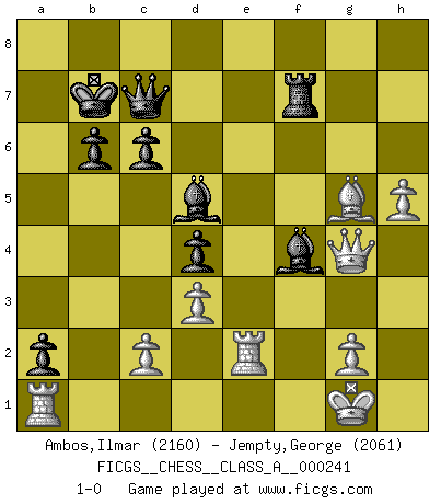 Last move : 1-0 2021 April 26 23:13:23 [Event "FICGS__CHESS__CLASS_A__000241"] [Site "FICGS"] [Date "2020.12.27"] [Round "1"] [White "Ambos,Ilmar"] [Black "Jempty,George"] [Result "1-0"] [WhiteElo "2160"] [BlackElo "2061"] 1.e4 e5 2.Nc3 Nf6 3.f4 d5 4.fxe5 Nxe4 5.Qf3 f5 6.d3 Nxc3 7.bxc3 d4 8.Be2 Nc6 9.Qg3 Be6 10.c4 Qd7 11.Rb1 O-O-O 12.h4 b6 13.Nh3 Bc5 14.Bd1 Rhe8 15.O-O h6 16.Bd2 Bg8 17.Rxf5 Bxc4 18.Nf4 Bxa2 19.Bg4 Kb8 20.e6 Qd6 21.Re1 a5 22.Qf3 Rf8 23.Qe4 Ne7 24.Re5 c6 25.Bh5 a4 26.Qh7 a3 27.Qxg7 Rg8 28.Qf6 Kb7 29.R5e2 Rdf8 30.Bf7 Rg4 31.h5 Nd5 32.Nxd5 Bxd5 33.Qf5 Rg7 34.Bxh6 Rgxf7 35.exf7 Rxf7 36.Qg5 Qc7 37.Qh4 Bd6 38.Ra1 a2 39.Bg5 Bg3 40.Qh3 Bf4 41.Qg4 1-0 Vienna gambit : Bardeleben variation Queenside Castling by player Black (move 11) Kingside Castling by player White (move 15) Player White won this chess game. Follow this game move after move (download)After black's reply to 1.e4 with 1..e5, leaves him always trying to get into the game. (Howard Staunton) Spiel ein langweiliges Spiel zu Ende und lustige Dinge können passieren. (Hans Ree) El Ajedrez es un invernadero donde los frutos del carácter pueden madurar mas completamente que en la vida. (Edward Morgan Foster) Les échecs, c'est la lutte contre l'erreur. (Johannes Zukertort) It is not enough to be a good player... you must also play well. (Siegbert Tarrasch)