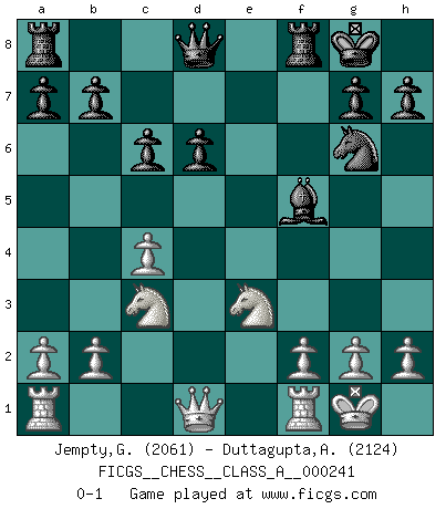 Last move : 0-1 2021 April 29 21:18:39 [Event "FICGS__CHESS__CLASS_A__000241"] [Site "FICGS"] [Date "2020.12.27"] [Round "1"] [White "Jempty,George"] [Black "Duttagupta,Aniruddha"] [Result "0-1"] [WhiteElo "2061"] [BlackElo "2124"] 1.e4 e5 2.Nf3 Nc6 3.Bb5 Nge7 4.O-O Ng6 5.d4 exd4 6.Nxd4 Bc5 7.Nf5 O-O 8.Be3 Bxe3 9.Nxe3 Nce7 10.Bd3 d6 11.c4 c6 12.Nc3 f5 13.exf5 Nxf5 14.Bxf5 Bxf5 0-1 Ruy Lopez : Cozio defense Kingside Castling by player White (move 4) Kingside Castling by player Black (move 7) Player Black won this chess game. Follow this game move after move (download)A Chess game is a dialogue, a conversation between a player and his opponent. Each move by the opponent may contain threats or be a blunder, but a player cannot defend against threats or take advantage of blunders if he does not first ask himself: What is my opponent planning after each move ? (Bruce A. Moon) Meine Liebe ist Schach, Schach, Schach. Ich muss jeden Tag Schach spielen, deshalb fühle ich mich so stark. (Miguel Najdorf) El estómago es una parte esencial del maestro de Ajedrez. (Bent Larsen) On n'a jamais que l'âge auquel on a commence à jouer aux échecs car après on cesse de vieillir. (Capablanca) The Internet is the world's largest library. It's just that all the books are on the floor. (John Allen Paulos)