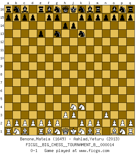 Last move : 0-1 2021 February 15 19:34:34 [Event "FICGS__BIG_CHESS__TOURNAMENT_B__000014"] [Site "FICGS"] [Date "2020.12.27"] [Round "1"] [White "Benone,Mateia"] [Black "Aahlad,Yeturu"] [Result "0-1"] [WhiteElo "1649"] [BlackElo "2013"] 1.j2-k4 h15-g13 2.h2-j4 j15-k13 3.n2-n3 e15-e13 0-1 This big chess game has been lost on time (started : 2020.12.27 10:47:15) Follow this game move after move (download)It is not a move, even the best move that you must seek, but a realizable plan. (Eugene Znosko-Borovsky) Vom Schach wurde gesagt das Leben sei dafür nicht lange genug. Aber das ist der Fehler des Lebens, nicht des Schach'. (Irving Chernev) Aquellos que dicen entender al Ajedrez, no entienden nada. (Robert Hubner) Aucun coup ne doit être joué sans but. (Pedro Damiano) The real danger is not that computers will begin to think like men, but that men will begin to think like computers. (Sydney J. Harris)