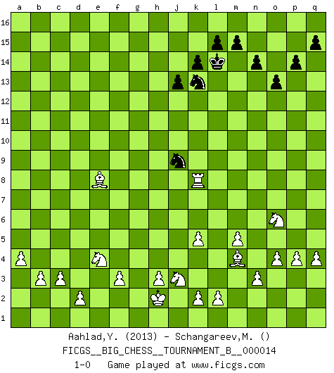 Last move : 1-0 2021 March 15 23:13:18 [Event "FICGS__BIG_CHESS__TOURNAMENT_B__000014"] [Site "FICGS"] [Date "2020.12.27"] [Round "1"] [White "Aahlad,Yeturu"] [Black "Schangareev,Mirzian"] [Result "1-0"] [WhiteElo "2013"] [BlackElo ""] 1.j2-k4 n15-n14 2.e2-e4 g15-g13 3.m2-m4 o16-d6 4.e4-e5 d6-c5 5.h2-g4 h16-a9 6.g1-f3 a9-n9 7.p1-o3 c5-f2 8.g4-f2 n9-f2 9.f1-b5 b15-b14 10.l1-p5 d15-d14 11.n2-n3 f15-f14 12.b5-g10 c15-c14 13.o1-f9 h15-k14 14.b1-c3 h14-h13 15.c3-e4 f2-b6 16.b2-b3 b6-b11 17.c1-a3 c16-m7 18.h1-o7 o15-o13 19.o7-m7 p16-o14 20.e4-f6 f16-o8 21.m7-l8 o8-k4 22.j3-k4 k16-l14 23.k1-j3 k14-j12 24.k4-k5 g16-h14 25.e1-e4 e15-e14 26.a1-e1 b11-p11 27.p5-m8 p11-l11 28.l8-l11 j12-l11 29.e4-a4 d14-d13 30.a3-g9 h14-j12 31.g9-b14 b16-d15 32.b14-f10 j14-j13 33.e1-e4 k15-k14 34.e4-b4 l16-j14 35.m4-m5 j16-k15 36.m1-m4 h13-h12 37.b4-b15 e16-e15 38.a4-a15 m16-d16 39.m4-c4 j15-g16 40.c4-c14 h12-h11 41.g10-h11 a16-a15 42.b15-a15 d15-e13 43.a15-e15 g16-e15 44.c14-e14 d16-e16 45.h11-j12 l11-j12 46.f9-j12 e13-g14 47.e14-f14 q16-f16 48.f14-f16 e16-f16 49.f10-e11 f16-c16 50.c2-c3 c16-a16 51.a2-a4 a16-a12 52.j12-o7 j14-b7 53.e11-g13 b7-f3 54.g2-f3 a12-g12 55.j1-h2 l14-j15 56.g13-e15 g14-e15 57.m8-e15 g12-e12 58.e15-c13 e12-e5 59.f6-e4 e5-e7 60.o3-n5 e7-f7 61.o7-m9 f7-p7 62.p2-p4 p7-p9 63.m9-g4 p9-o9 64.o2-o4 o9-c9 65.c13-m4 o14-n12 66.q2-q4 n12-m10 67.g4-k7 c9-k9 68.k7-d13 k9-d9 69.d13-f11 k15-l14 70.f11-d9 m10-n8 71.n5-m7 n8-m6 72.m7-o6 p15-p14 73.q1-g1 j15-k13 74.d9-e8 m6-k7 75.g1-g8 k7-j9 76.g8-k8 1-0 Follow this game move after move (download)The chessboard is the world, the pieces are the phenomena of the Universe, the rules of the game are what we call the laws of Nature and the player on the other side is hidden from us. (Thomas Huxley) Wenn Dein Gegner dir ein Remis anbietet, versuch herauszufinden, weshalb er glaubt schlechter zu stehen. (Nigel Short) El Ajedrez es un regaderazo frío para la mente. (Sir John Simon) Le joueur d'Echecs qui veut atteindre le top est obligé de développer son propre credo créatif. Alexeï Stepanovicth Souétine. Il est facile d'écrire des livres ! Ce qui est difficile, c'est de jouer ! (Alexeï Stepanovicth Souétine) Just because you do not take an interest in politics doesn't mean politics won't take an interest in you. (Pericles 430 B.C.)