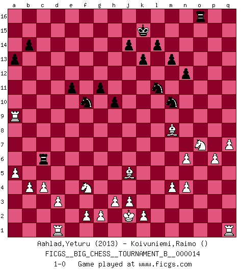 Last move : 1-0 2021 April 25 6:50:54 [Event "FICGS__BIG_CHESS__TOURNAMENT_B__000014"] [Site "FICGS"] [Date "2020.12.27"] [Round "1"] [White "Aahlad,Yeturu"] [Black "Koivuniemi,Raimo"] [Result "1-0"] [WhiteElo "2013"] [BlackElo ""] 1.j2-k4 e15-e13 2.e2-e4 d15-d13 3.h1-o7 c16-e14 4.o7-o15 p16-q14 5.o15-b3 b15-b14 6.m2-m4 j15-g14 7.h2-g4 f16-c13 8.b3-b6 h16-l13 9.p1-o3 e14-o5 10.f1-c4 h15-j13 11.l1-p5 p15-p14 12.b6-f6 n15-n13 13.f6-f15 b16-c14 14.f15-d13 c14-b12 15.d13-f15 j16-h15 16.f15-c15 q14-o13 17.c4-h9 e13-e12 18.c15-n5 o5-l2 19.k4-l2 l13-l2 20.k1-l3 l2-c10 21.b1-c3 o16-p15 22.n2-n3 m15-m13 23.o1-g8 l15-l14 24.d2-d3 n13-n12 25.e4-e5 g16-f14 26.e1-e4 b12-d13 27.c1-l9 j13-g12 28.g8-f7 c10-b10 29.b2-b3 g12-f10 30.h9-k11 h14-h13 31.a1-e1 q16-o16 32.n5-q8 q15-q13 33.q8-p9 k16-m15 34.p9-p14 o16-p16 35.p14-q13 m15-o14 36.q13-j6 o13-m12 37.k11-j10 l16-p12 38.j6-k6 k15-k13 39.l9-p13 m16-o16 40.p5-l9 f10-e8 41.k6-j7 c13-j7 42.l9-j7 g14-h12 43.j7-g5 b10-c11 44.e4-c4 c11-e11 45.j10-h9 e8-f10 46.g5-j7 f14-g12 47.c4-c10 e11-d12 48.e1-e4 e12-e11 49.h9-m5 a16-d16 50.j7-l9 g15-g13 51.c3-d5 d16-c16 52.c2-c4 h12-k11 53.l9-n7 h13-h12 54.a2-a4 d13-b12 55.c10-c16 e16-c16 56.n7-l5 m12-o11 57.p13-g5 o14-m15 58.o3-n5 g12-h10 59.q2-q4 b12-d11 60.p2-p4 d12-b12 61.b3-b4 g13-g12 62.o2-o4 b12-g7 63.f7-k11 h10-k11 64.g5-h6 g7-a7 65.a4-a5 o11-n9 66.m5-n6 h12-h11 67.g1-f3 p12-g4 68.h6-e3 a7-d7 69.e4-g4 d7-e6 70.o4-o5 p15-e5 71.f3-e5 e6-e5 72.j1-j2 e5-f5 73.m1-d1 m15-k14 74.p4-p5 k14-j12 75.p5-p6 k11-j9 76.q4-q5 d11-e9 77.q5-q6 o16-o14 78.q6-q7 j9-k7 79.l5-k6 n9-l10 80.g4-g9 e9-g8 81.n6-k9 l10-j9 82.k9-f5 h11-h10 83.g9-a9 a15-a13 84.n3-n4 k7-h6 85.f5-g6 g12-g11 86.l3-j4 h15-j15 87.j4-h6 g8-h6 88.e3-h6 c16-c6 89.d5-f4 o14-o6 90.h6-j5 j9-l8 91.k6-o10 j15-k15 92.g6-k9 l8-m10 93.k9-n6 p16-o16 94.n5-o7 j12-l11 95.o10-m8 o6-n6 96.o5-n6 1-0 Follow this game move after move (download)You know you're going to lose. Even when I was ahead I knew I was going to lose. - On playing against Fischer. (Andrew Soltis) Privat ist Kortschnoi kein schlechter Mensch, sehr sympathisch. Aber während des Spiels ist er grausam. Er will dich töten. (Miguel Najdorf) El tablero es el mundo, las piezas es el fenomeno del universo, las reglas del juego son lo que llamamos leyes de la naturaleza y el jugador del lado opuesto, se encuentra oculto a nuestra vista. (Thomas Huxley) Même si vous avez un bon coup à faire, regardez toujours s'il n'y en a pas un qui lui soit préférable. (Pedro Damiano) Drag your thoughts away from your troubles... by the ears, by the heels, or any other way you can manage it. (Mark Twain)
