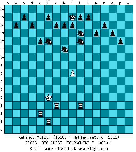 Last move : 0-1 2021 May 23 19:17:22 [Event "FICGS__BIG_CHESS__TOURNAMENT_B__000014"] [Site "FICGS"] [Date "2020.12.27"] [Round "1"] [White "Kehayov,Yulian"] [Black "Aahlad,Yeturu"] [Result "0-1"] [WhiteElo "1630"] [BlackElo "2013"] 1.j2-k4 h15-g13 2.h2-g4 e15-e13 3.h1-o7 m15-m13 4.m2-m4 p16-o14 5.n2-n4 b16-c14 6.e2-e4 f16-b12 7.g1-j2 d15-d14 8.d2-d4 j15-k13 9.p1-o3 h16-m12 10.e4-e5 m12-n12 11.c1-l9 n12-c2 12.b1-c3 c2-b2 13.o7-c7 l16-o13 14.e1-e2 b2-a1 15.k1-h2 o13-d3 16.j2-g3 d3-e2 17.g3-e2 a1-b2 18.o1-f9 g16-j15 19.l1-p5 b2-b10 20.l9-n7 n15-n14 21.e2-g3 o16-f8 22.f1-c4 b10-c11 23.c7-c11 b12-c11 24.k4-j6 c16-h11 25.f9-h11 g13-h11 26.m1-m3 k16-l14 27.m3-k3 o14-n12 28.q1-m1 c14-d12 29.k3-k8 l14-k12 30.g3-h5 e13-e12 31.k8-h8 e16-e13 32.m1-m3 e13-c13 33.c4-b3 j15-h13 34.j1-j2 d12-e10 35.n7-k4 f8-k4 36.h5-k4 h13-f12 37.m3-l3 c11-d12 38.h8-b8 c13-c3 39.b8-b15 d12-b14 40.p5-n7 f12-e14 41.b15-b14 a15-b14 42.l3-l5 a16-a7 43.l5-p5 a7-n7 44.n4-n5 p15-p13 45.p5-p10 e14-f12 46.p10-p9 n7-d7 47.d4-d5 j16-j15 48.p9-a9 m16-a16 49.a9-o9 o15-o13 50.l2-l3 q15-q13 51.e5-e6 d7-d8 52.o9-o7 a16-a8 53.o7-l7 d8-p8 54.p2-p3 p8-o8 55.o3-m2 o8-o2 56.m2-l4 o2-q2 57.p3-p4 q16-a16 58.p4-p5 a8-p8 59.p5-p6 p8-p6 60.l7-g7 g15-g14 61.g7-h7 q13-q12 62.h7-h8 q12-q11 63.h8-g8 p13-p12 64.g8-h8 q11-q10 65.h8-k8 q10-q9 66.k8-h8 q9-q8 67.h8-q8 q2-q8 68.l4-k6 p6-k6 69.j2-k3 q8-q2 70.b3-a4 a16-a4 71.a2-a3 a4-a3 72.f2-f3 c3-c1 73.d5-d6 a3-a6 74.d6-d7 a6-e6 75.d7-d8 e10-d8 76.k3-j4 q2-k2 77.j4-j5 k6-k10 78.j5-h4 c1-l1 79.m4-m5 d8-f7 80.n5-n6 f7-e5 81.g4-e5 e6-e5 82.h2-g4 k10-h10 83.k4-h5 e5-h5 84.h4-g3 l1-l3 85.j6-h4 h5-m5 86.n6-n7 n12-m10 87.n7-n8 m10-n8 88.g3-f4 n8-l7 89.f4-g3 l7-k5 90.h4-k5 m5-k5 91.j3-j4 k5-k4 92.j4-j5 h10-g10 93.j5-j6 l3-l2 94.j6-j7 k2-g2 95.g3-f4 g10-f10 96.f4-g5 f10-f3 97.g5-h5 f3-h3 98.h5-g5 g2-g4 99.g5-f5 h3-e3 100.j7-j8 l2-f2 0-1 Follow this game move after move (download)Chess is mental torture. (Garry Kasparov) Spielt Blackmar-Diemer-Gambit, und das Matt kommt von selbst! (Emil Joseph Diemer) Solo los afeminados hacen el Enroque. (Rob Sillars) Le plus grand jeu de l'esprit jamais inventé, plus vous l'apprenez, plus vous y prenez du plaisir. (Garry Kasparov) The greatest con, that he ever pulled... was making you believe... that he is you. (Revolver, movie)