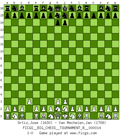 Last move : 1-0 2020 December 28 13:29:45 [Event "FICGS__BIG_CHESS__TOURNAMENT_B__000014"] [Site "FICGS"] [Date "2020.12.27"] [Round "1"] [White "Ortiz,Jose"] [Black "Van Mechelen,Jan"] [Result "1-0"] [WhiteElo "1630"] [BlackElo "1708"] 1.d2-d3 1-0 Follow this game move after move (download)Those who say they understand Chess, understand nothing. (Robert Hubner) Besser ein falscher Plan, logisch durchgeführt, als gar kein Plan. (Viktor Kortschnoi) La partida mas dura de ganar es una partida ganada. (Emanuel Lasker) Les réformistes prétendent que les progrès de la théorie conduiront à la disparition des échecs, et qu'il faut, pour leur rendre vie, en remanier les règles. En réalité, qu'exprime cette affirmation? Le mépris de l'intuition, de l'imagination et de tous les autres éléments qui font des échecs un art. (Alexander Alekhine) Logic : The art of thinking and reasoning in strict accordance with the limitations and incapacities of the human misunderstanding. (Ambrose Bierce)