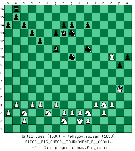 Last move : 1-0 2021 August 3 8:12:3 [Event "FICGS__BIG_CHESS__TOURNAMENT_B__000014"] [Site "FICGS"] [Date "2020.12.27"] [Round "1"] [White "Ortiz,Jose"] [Black "Kehayov,Yulian"] [Result "1-0"] [WhiteElo "1630"] [BlackElo "1630"] 1.b1-c3 j15-k13 2.d2-d4 h16-o10 3.c1-k8 d15-d14 4.p1-o3 o10-f2 5.g1-f3 f2-m8 6.k8-o12 m15-m13 7.m2-m4 m8-l8 8.k1-l3 l8-l12 9.o12-g5 e15-e13 10.l1-p5 f16-e15 11.e2-e4 n15-n13 12.n2-n3 e15-p5 13.o3-p5 o16-j11 14.p5-n4 b16-c14 15.k2-k3 l16-o13 16.o1-n2 c16-k9 17.f3-d2 p16-o14 18.f1-c4 l12-l11 19.h1-g1 e16-e14 20.g1-e3 h15-g13 21.g5-m10 l11-k11 22.c4-k11 o13-l10 23.n2-g8 l10-k11 24.g8-k11 e14-f14 25.j1-k2 f14-f10 26.m10-j7 k9-j10 27.j7-f10 m16-m14 28.e1-f1 j10-k11 29.q2-q3 m14-l14 30.f1-f3 g16-j15 31.o2-o3 l14-l10 32.f10-h8 m13-m12 33.a2-a3 l10-h10 34.h8-j9 h10-g10 35.g2-g4 k16-h15 36.e3-p13 q16-p16 37.p13-p11 k11-j12 38.p11-n13 h15-j13 39.j9-m12 j11-m14 40.n13-n11 j16-h15 41.a1-f1 f15-f14 42.f3-f5 g10-h10 43.j2-k4 h10-h11 44.n11-q8 h11-m11 45.m12-f6 o14-m15 46.q8-p8 m11-p11 47.p8-b8 a16-b16 48.b8-j8 q15-q14 49.f6-h4 c14-e15 50.f1-f2 p11-p2 51.m1-f1 j13-g12 52.j8-h7 m15-o14 53.f2-f3 e15-d13 54.f5-h5 a15-a14 55.h4-c9 m14-j11 56.c9-g13 f14-g13 57.f3-f15 b16-c16 58.o3-o4 p2-p10 59.f1-f11 j11-h12 60.h5-j5 j12-f15 61.f11-f15 g12-f14 62.h7-m7 p10-b10 63.m7-f13 j15-g14 64.f15-f14 d13-f14 65.f13-f7 p16-o16 66.b2-b4 c16-n16 67.q1-p1 p15-p14 68.f7-f6 o14-m13 69.f6-b10 n16-b16 70.p1-p6 q14-q13 71.b10-m10 m13-l11 72.d2-f3 o16-m16 73.m10-p10 l15-l14 74.p10-o9 m16-o16 75.q3-q4 o15-o14 76.o9-o11 p14-p13 77.o11-o13 q13-q12 78.o13-m15 g14-j13 79.p6-c6 c15-c14 80.k4-l6 o14-o13 81.c6-d6 d14-d13 82.l6-k8 p13-p12 83.k8-j10 l11-j10 84.m15-q15 q12-q11 85.j5-n5 o13-o12 86.n5-n15 h15-j15 87.d6-n6 j15-h15 88.q15-q13 o16-p16 89.q13-q15 h12-q4 90.n15-k15 h15-g14 91.n6-h6 p16-h16 92.k15-g15 g14-f13 93.h6-f6 f13-g12 94.q15-n12 q4-h12 95.n12-n6 k13-l11 96.n6-g6 g12-h13 97.g6-l10 h13-g12 98.g15-f15 h16-f16 99.l10-g6 g12-h13 100.f15-f14 f16-f14 101.f6-f14 e13-e12 102.f14-f15 p12-p11 103.f15-o15 q11-q10 104.o15-o12 p11-p10 105.o12-o10 p10-p9 106.g6-m6 h12-g11 107.m6-p6 1-0 Follow this game move after move (download)A thorough understanding of the typical mating continuations makes the most complicated sacrificial combinations leading up to them not only not difficult, but almost a matter of course. (Siegbert Tarrasch) Fallen sollten polizeilich verboten werden. (Savielly Grigorievitsch Tartakower) El Ajedrez es un juego de pelea el cual es puramente intelectual e incluye la suerte. (Richard Reti) Le thème de l'attaque double intervient d'une manière ou d'une autre dans l'immense majorité des combinaisons. (Youri Averbakh) It's not the will to win, but the will to prepare to win that makes the difference. (Bear Bryant)