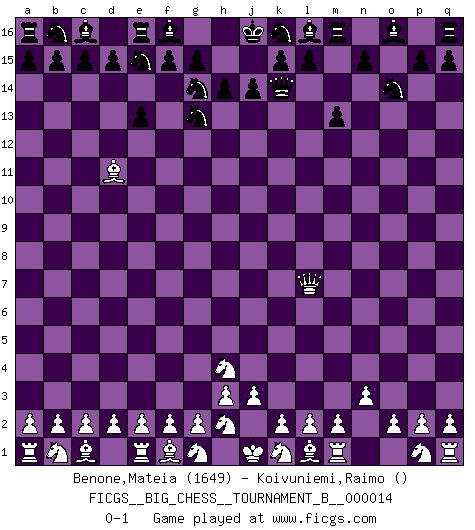 Last move : 0-1 2021 February 6 12:39:37 [Event "FICGS__BIG_CHESS__TOURNAMENT_B__000014"] [Site "FICGS"] [Date "2020.12.27"] [Round "1"] [White "Benone,Mateia"] [Black "Koivuniemi,Raimo"] [Result "0-1"] [WhiteElo "1649"] [BlackElo ""] 1.j2-h4 e15-e13 2.h1-o7 h15-g13 3.o7-o15 m15-m13 4.o15-o7 p16-o14 5.n2-n3 j15-g14 6.o1-d11 g16-e15 7.o7-l7 h16-k14 0-1 This big chess game has been lost on time (started : 2020.12.27 10:47:15) Follow this game move after move (download)Chess, like love, is infectious at any age. (Flohr) Vielleicht wirkt die Aura früherer Spieler glanzvoller als die der heutigen Spieler, aber das liegt daran, dass man kein Programm wie Fritz hatte, das einem all die Löcher in ihren Partien zeigt. (Vladimir Kramnik) Bobby es el jugador de Ajedrez mas fino que este país jamás haya producido. Su memoria para las movidas, su brillantez en soñar combinaciones y su feróz determinación por la victoria son algo extraño. (John Collins) C'est la seule position que je connaisse où les deux camps sont mals. Propos prêtés à V. Anand. He who laughs last probably does not get the joke. (Unknown)