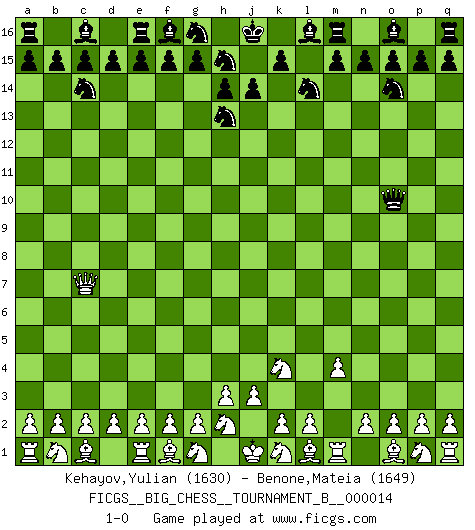 Last move : 1-0 2021 February 9 16:32:31 [Event "FICGS__BIG_CHESS__TOURNAMENT_B__000014"] [Site "FICGS"] [Date "2020.12.27"] [Round "1"] [White "Kehayov,Yulian"] [Black "Benone,Mateia"] [Result "1-0"] [WhiteElo "1630"] [BlackElo "1649"] 1.j2-k4 j15-h13 2.h1-o7 p16-o14 3.o7-c7 h16-o10 4.c7-l15 k16-l14 5.l15-c7 b16-c14 6.m2-m4 1-0 This big chess game has been lost on time (started : 2020.12.27 10:47:15) Follow this game move after move (download)All my games are real. (Bobby Fischer) Heutzutage gewinnt im Turnier nicht derjenige Spieler, der weitreichende Pläne entwirft, sondern einfach jener, der Zug um Zug kämpft. (David Bronstein) La última cosa en que Fischer estaba interesado era en tonterías, siempre y cuando el Ajedrez estuviera involucrado. (Elie Agur) J'ai toujours senti une vague pitié pour l'homme qui ne connaît rien aux échecs, tout comme j'en aurais pour un homme ignorant de l'amour. Les Echecs, comme la musique ou comme l'amour, ont le pouvoir de rendre heureux. (Siegbert Tarrasch) Chess is everything: art, science and sport. (Anatoly Karpov)