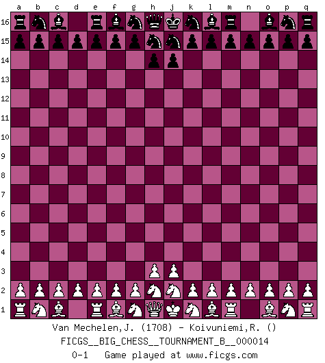 Last move : 0-1 2020 December 27 14:6:56 [Event "FICGS__BIG_CHESS__TOURNAMENT_B__000014"] [Site "FICGS"] [Date "2020.12.27"] [Round "1"] [White "Van Mechelen,Jan"] [Black "Koivuniemi,Raimo"] [Result "0-1"] [WhiteElo "1708"] [BlackElo ""] 0-1 Follow this game move after move (download)To avoid losing a piece, many a person has lost the game. (Savielly Tartakover) Der Vorposten provoziert a) eine Basis für neue Angriffe und b) eine Schwächung der gegnerischen Widerstandskraft in der fraglichen Linie. (Aaron Nimzowitsch) Yo jugué Ajedrez con el y a veces le pude haber ganado solo que siempre devuelve su última jugada y juega la partida de manera diferente. (Mark Twain) Je ne crois pas en la psychologie, je crois aux bons coups. (Robert Fischer) It is not titles that honor men, but men that honor titles. (Niccolo Machiavelli)