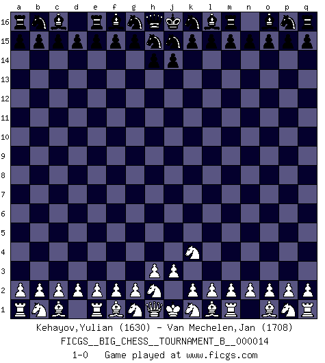 Last move : 1-0 2020 December 27 14:7:5 [Event "FICGS__BIG_CHESS__TOURNAMENT_B__000014"] [Site "FICGS"] [Date "2020.12.27"] [Round "1"] [White "Kehayov,Yulian"] [Black "Van Mechelen,Jan"] [Result "1-0"] [WhiteElo "1630"] [BlackElo "1708"] 1.j2-k4 1-0 Follow this game move after move (download)You are for me the Queen on d8 and I am the Pawn on d7 !! (Eduard Gufeld) Der Knackpunkt bei der Konzentration ist, daß wir nur durch sie etwas Neues und Ungewöhnliches am Schachbrett finden können. Sie ist der einzige Weg durch neue neue Ideen eine Überraschung zu bereiten. (Garry Kasparov) Si tu oponente te ofrece un empate, trata de averiguar porque piensa él que esta en una posición peor. (Nigel Short) Si rien de grave n'est détecté lors de l'analyse d'une position, on joue alors le coup. Seconde règle de Blumenfeld. Convictions are more dangerous enemies of truth than lies. (Friedrich Nietzsche)