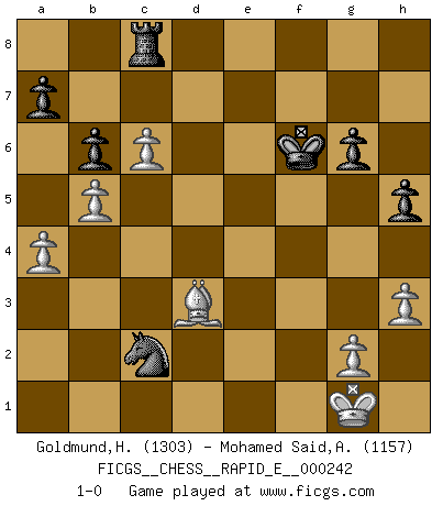 Last move : 1-0 2021 May 8 2:13:24 [Event "FICGS__CHESS__RAPID_E__000242"] [Site "FICGS"] [Date "2020.12.27"] [Round "1"] [White "Goldmund,Heike"] [Black "Mohamed Said,Azaim"] [Result "1-0"] [WhiteElo "1303"] [BlackElo "1157"] 1.b4 Nf6 2.Bb2 d6 3.e3 b6 4.Nf3 Bg4 5.Be2 g6 6.O-O Bg7 7.c4 O-O 8.h3 Bxf3 9.Bxf3 d5 10.d3 c6 11.Qb3 e6 12.Nd2 Na6 13.a4 Qe7 14.b5 Nc5 15.Qc3 Ne8 16.d4 cxb5 17.cxb5 Nd6 18.dxc5 Bxc3 19.Bxc3 Nf5 20.c6 Qc5 21.Rfc1 Qd6 22.Be2 Rac8 23.Bf6 e5 24.Bg5 f6 25.Bxf6 Rxf6 26.Nf3 e4 27.Nh2 Ne7 28.Ng4 Rf7 29.Nh6+ Kg7 30.Nxf7 Kxf7 31.Bg4 Nf5 32.Rd1 h5 33.Be2 Qf6 34.Bf1 d4 35.exd4 e3 36.fxe3 Nxe3 37.Re1 Qxd4 38.Kh1 Nc2 39.Red1 Qxa1 40.Rxa1 Nxa1 41.Bc4+ Kf6 42.Kg1 Nc2 43.Bd3 1-0 This chess game has been lost on time (started : 2020.12.27 16:38:38) Polish (Sokolsky) opening Kingside Castling by player White (move 6) Kingside Castling by player Black (move 7) Player White won this chess game. Follow this game move after move (download)Alekhine is a poet who creates a work of art out of something that would hardly inspire another man to send home a picture post card. (Max Euwe) Die Jungen erwarten, dass Opa einfach umfällt. Dann aber kann Opa fünf Stunden lang Schach spielen und die jungen Gegner an die Wand drücken. (Viktor Kortschnoi) Existen dos clases de sacrificios: los correctos y los míos. (Mikhail Tal) A ce moment-là, je menaçais de comprendre la position ! (Clément L'Heureux) The meaning of life is that it is to be lived, and it is not to be traded and conceptualized and squeezed into a pattern of systems. (Bruce Lee)