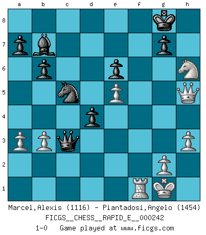 Last move : 1-0 2021 February 20 1:11:18 [Event "FICGS__CHESS__RAPID_E__000242"] [Site "FICGS"] [Date "2020.12.27"] [Round "1"] [White "Marcel,Alexis"] [Black "Piantadosi,Angelo"] [Result "1-0"] [WhiteElo "1116"] [BlackElo "1454"] 1.f4 d5 2.Nf3 c5 3.e3 Nc6 4.b3 e6 5.Bb2 Nf6 6.Be2 Be7 7.O-O O-O 8.a3 b6 9.Nc3 Bb7 10.Qe1 Rc8 11.h3 Nd7 12.Nd1 Bf6 13.Bxf6 Nxf6 14.Nf2 Re8 15.Ne5 Nxe5 16.fxe5 Nd7 17.Ng4 d4 18.exd4 cxd4 19.d3 Rxc2 20.Rc1 Qc7 21.Qf2 Re7 22.Rxc2 Qxc2 23.Bd1 Qxd3 24.Bc2 Qc3 25.Bxh7+ Kxh7 26.Qh4+ Kg8 27.Qxe7 Nc5 28.Qxf7+ Kh8 29.Qh5+ Kg8 30.Nh6+ 1-0 Bird's Opening Kingside Castling by player White (move 7) Kingside Castling by player Black (move 7) Player White won this chess game. Follow this game move after move (download)I'm not afraid of Spassky. The world knows I'm the best. You don't need a match to prove it. (Bobby Fischer) Ohne Fehler kann es keine Brillanz geben. (Emanuel Lasker) El muchacho (en ese entonces un niño de 12 años llamado Anatoly Karpov) no tiene ni idea de lo que es el Ajedrez y no hay futuro en absoluto para el en esta profesión. (Mikhail Botvinnik) Avant la finale, les dieux ont créé le milieu de partie. (Tarrasch) A good book on your shelf is a friend that turns its back on you and remains a friend. (Author unknown)