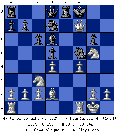 Last move : 1-0 2021 January 14 13:56:45 [Event "FICGS__CHESS__RAPID_E__000242"] [Site "FICGS"] [Date "2020.12.27"] [Round "1"] [White "Martinez Camacho,Victor Hugo"] [Black "Piantadosi,Angelo"] [Result "1-0"] [WhiteElo "1297"] [BlackElo "1454"] 1.e4 e6 2.f4 d5 3.exd5 exd5 4.Nf3 Bd6 5.d4 Ne7 6.Bd3 Bf5 7.Qe2 O-O 8.O-O Bxd3 9.Qxd3 c6 10.Bd2 Nd7 11.Nc3 Re8 12.Ng5 g6 13.Qh3 Nf5 14.Qxh7+ Kf8 15.Qxf7+ 1-0 French : Labourdonnais variation Kingside Castling by player Black (move 7) Kingside Castling by player White (move 8) Player White won this chess game. Follow this game move after move (download)Only the player with the initiative has the right to attack. (Wilhelm Steinitz) Schach verlangt totale Konzentration. (Robert James Fischer) No volvere nunca a jugar contigo. Has insultado a mi amigo. - cuando un oponente se maldijo por una mala jugada (Miguel Najdorf) Celui qui prend des risques peut perdre, celui qui n'en prend pas perd toujours. (Xavier Tartacover) However beautiful the strategy, you should occasionally look at the results. (Winston Churchill)