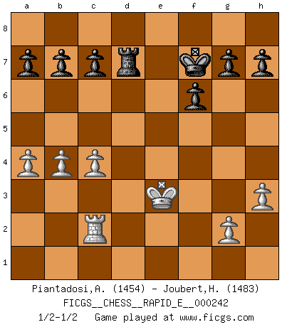 Last move : 1/2-1/2 2021 February 10 23:56:44 [Event "FICGS__CHESS__RAPID_E__000242"] [Site "FICGS"] [Date "2020.12.27"] [Round "1"] [White "Piantadosi,Angelo"] [Black "Joubert,Hennie"] [Result "1/2-1/2"] [WhiteElo "1454"] [BlackElo "1483"] 1.d4 d5 2.c4 e5 3.dxe5 d4 4.Nf3 Nc6 5.e3 Bb4+ 6.Bd2 dxe3 7.fxe3 Bg4 8.a3 Bxd2+ 9.Nbxd2 Nxe5 10.Be2 Nxf3+ 11.Bxf3 Bxf3 12.Nxf3 Nf6 13.O-O O-O 14.Qxd8 Raxd8 15.Rad1 Ng4 16.Rxd8 Rxd8 17.h3 Nxe3 18.Rc1 f6 19.Kf2 Nf5 20.b4 Rd3 21.a4 Nd4 22.Nxd4 Rxd4 23.Ke3 Rd7 24.Rc2 Kf7 1/2-1/2 QGD : Albin counter-gambit Kingside Castling by player White (move 13) Kingside Castling by player Black (move 13) This chess game ended in a draw. Follow this game move after move (download)I have always a slight feeling of pity for the man who has no knowledge of Chess. (Siegbert Tarrasch) Kasparov ist eine Art Monster mit hundert Augen, denen auch nicht das Geringste entgeht. (Tony Miles) La señal de un Gran Maestro es su habilidad de ganar una partida rápidamente y sin dolor. (Irving Chernev) Le système Elo représente seulement une moyenne. Il est simplement un indicateur de votre stabilité. (Anatoli Karpov) O divine art of subtlety and secrecy! Through you we learn to be invisible, through you inaudible and hence we can hold the enemy's fate in our hands. (Sun Tzu)